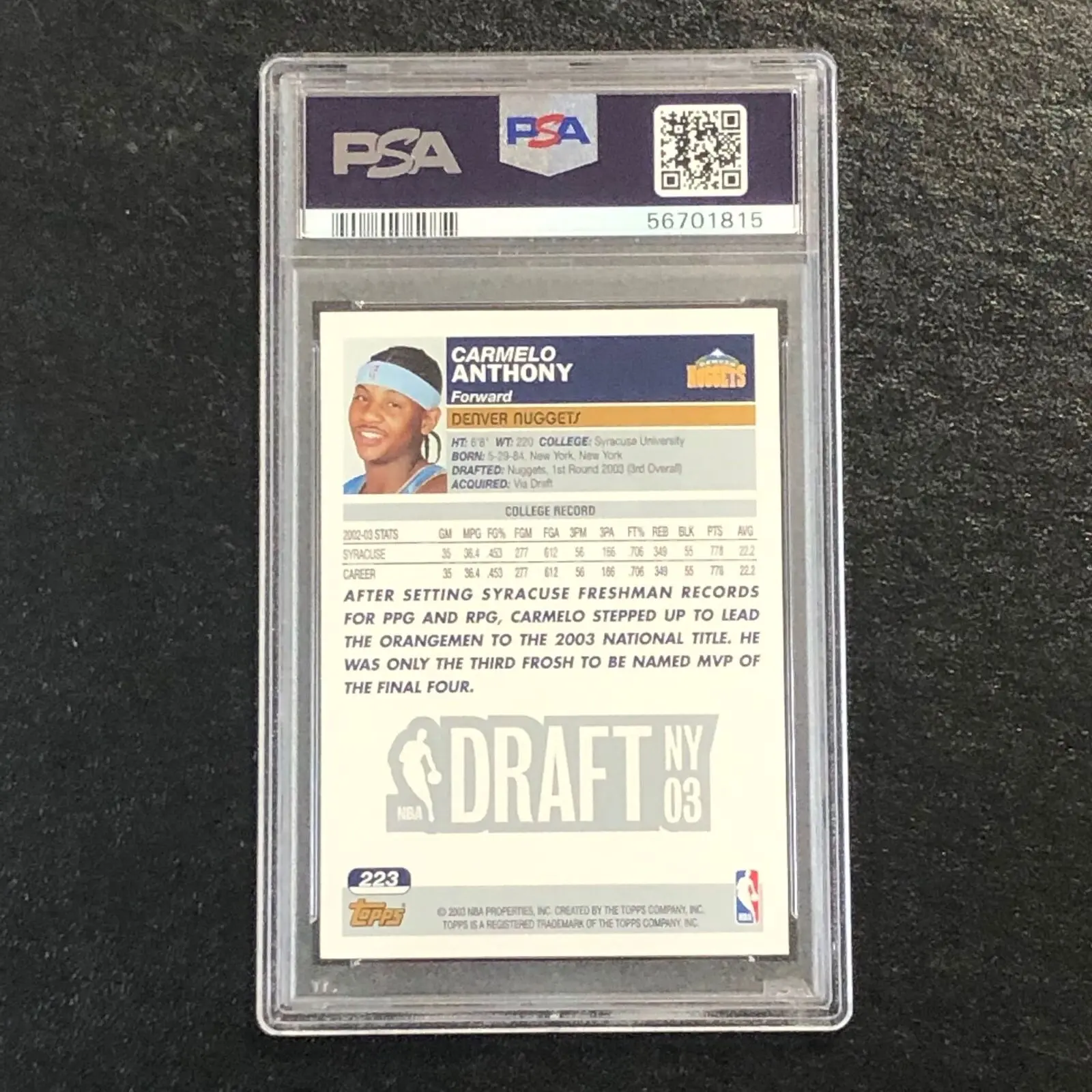 This listing features a 2003 Topps #223 Carmelo Anthony, professionally authenticated.