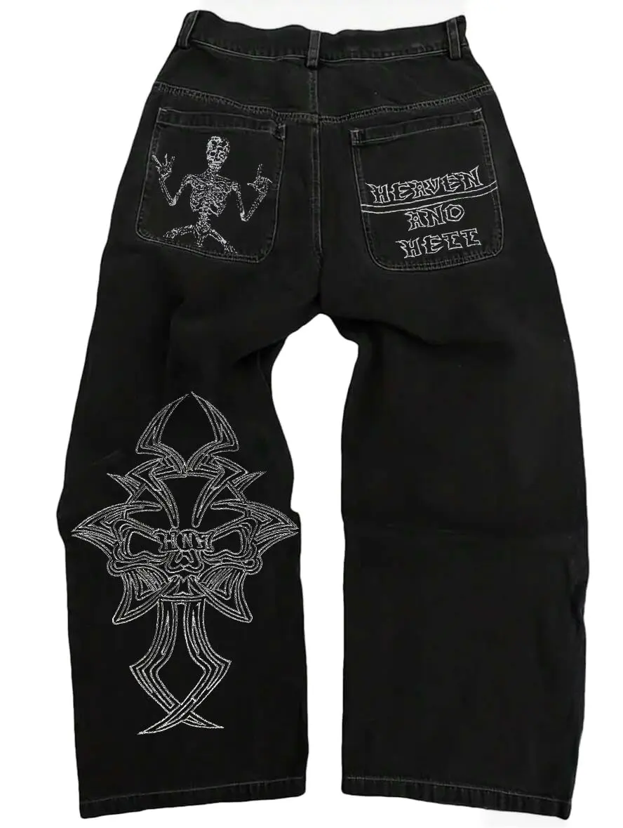 OATSBAS Y2K Beggy Jeans for Women Men Denim Pants Skull Embroidery Gothic Jeans Straight Wide Leg Trouser (X-LargeBlack-White)