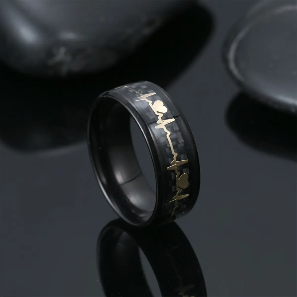 New Fashionable 8mm Stainless Steel Ring, Heartbeat Design with Carbon Fiber - Wedding Party Promise Ring