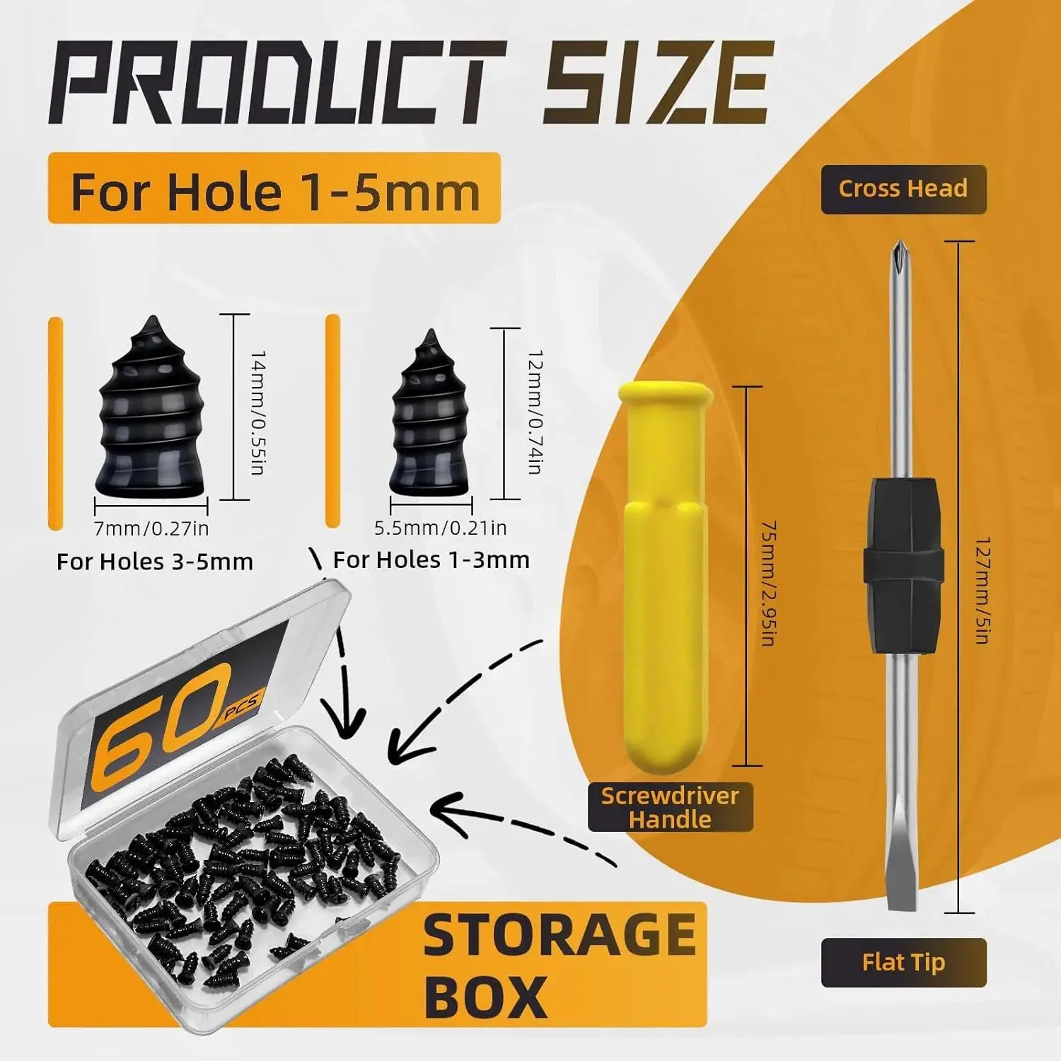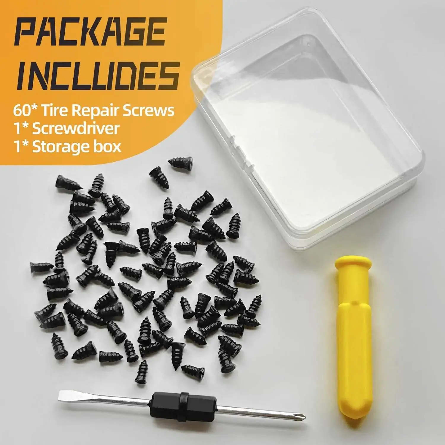 PERFECT SEALING EFFECT & LIFE TIME WARRANTY: These tire repair screws come pre-coated with a layer of strong sealing glue, which fits closely to the tire, preventing air leakage and water from entering the damaged area. You can return or exchange these rubber nails for tires freely within 360 days. If, for any reason, you are not satisfied with our 60pcs tire repair rubber screws, please contact us first; we would be happy to provide friendly customer service. (Package includes: 30* big screws, 30* small screws, 1 * double-ended screwdriver, and 1* storage box.)