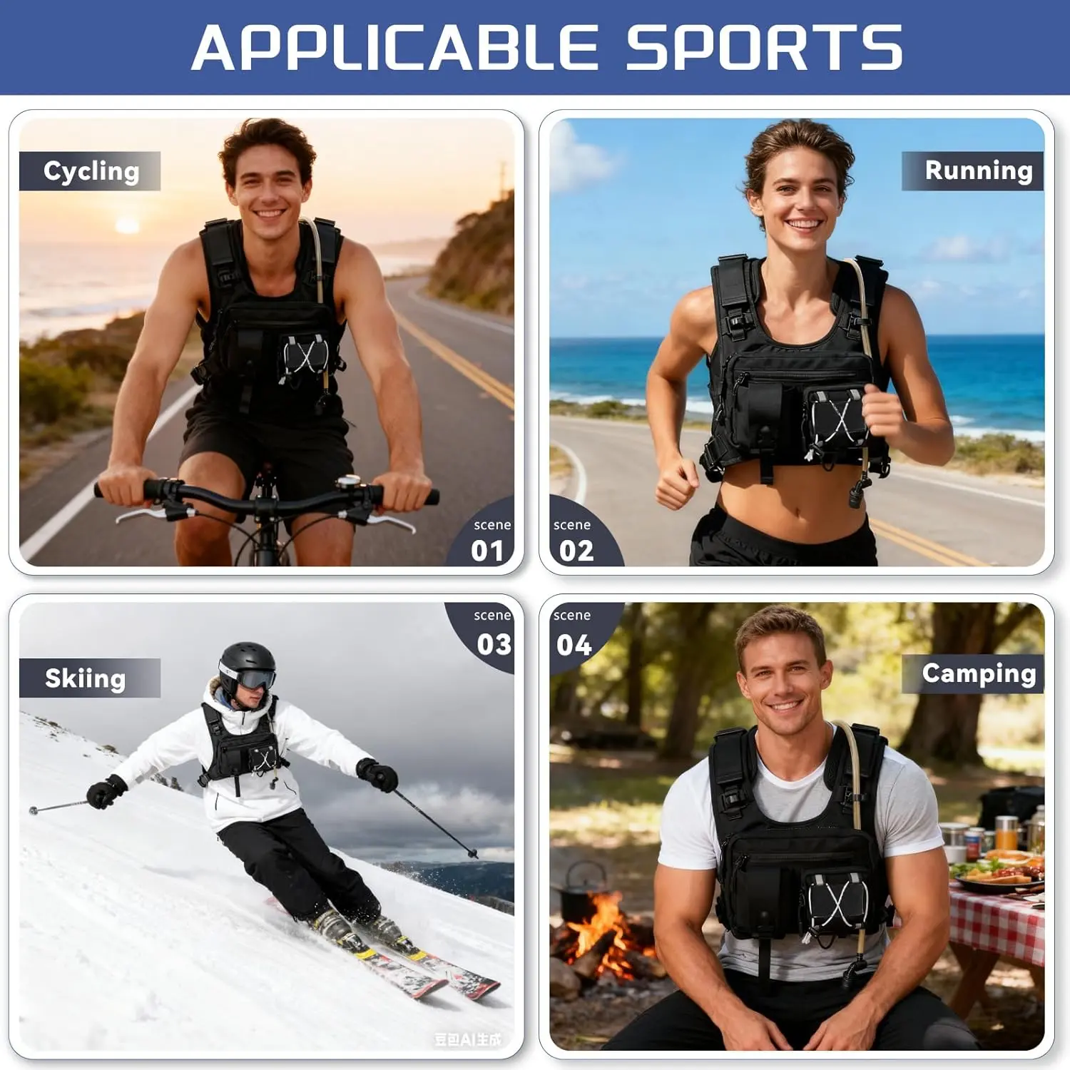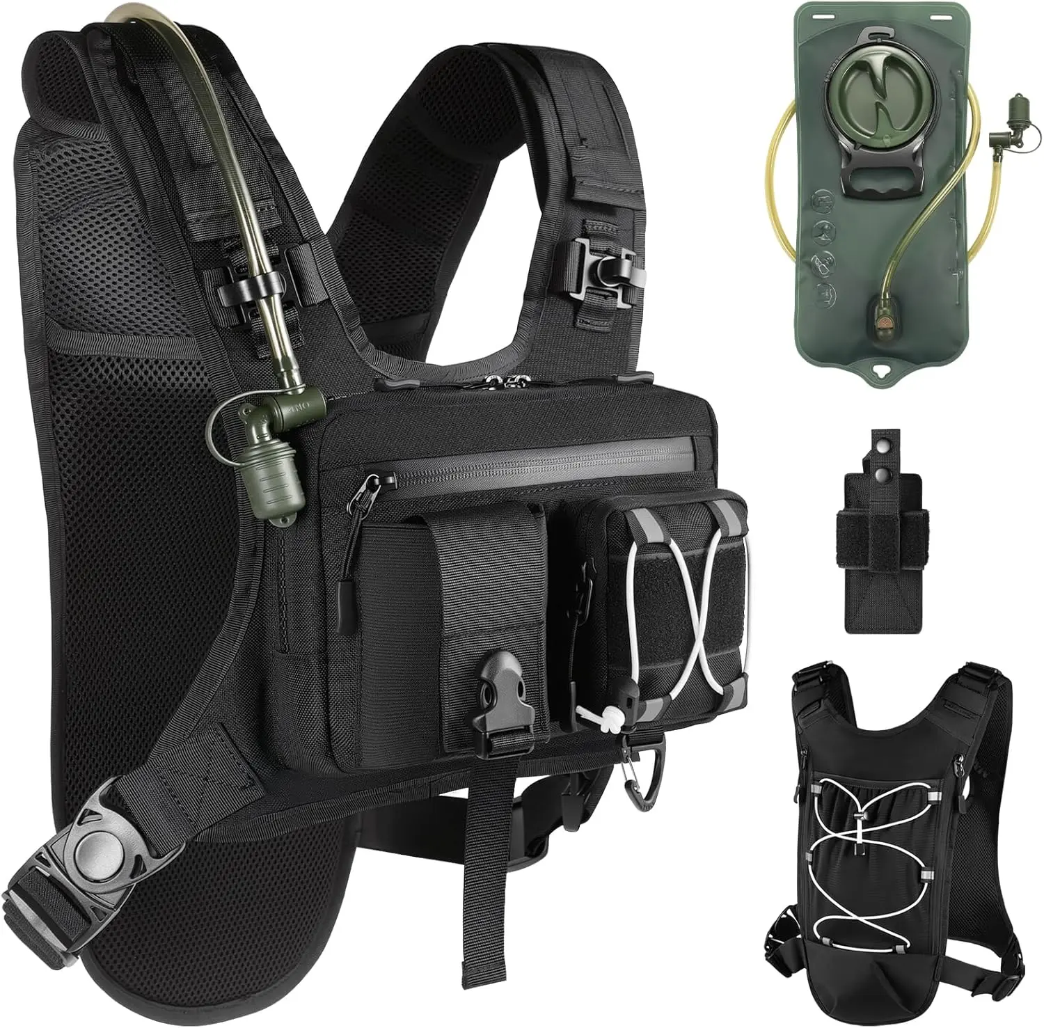 ·【Durable & Breathable】The front chest bag and rear water backpack is made of waterproof and scratch-resistant 1000D ord fabric, protecting your essentials from rain and sharp objects. The lightweight and breathable mesh backpack enhances air circulation and moisture-wicking, Relieve your fatigue, make your sport more comfortable. the Reflective strip front and back improve low-light visibility and makes every run farther, safer!
