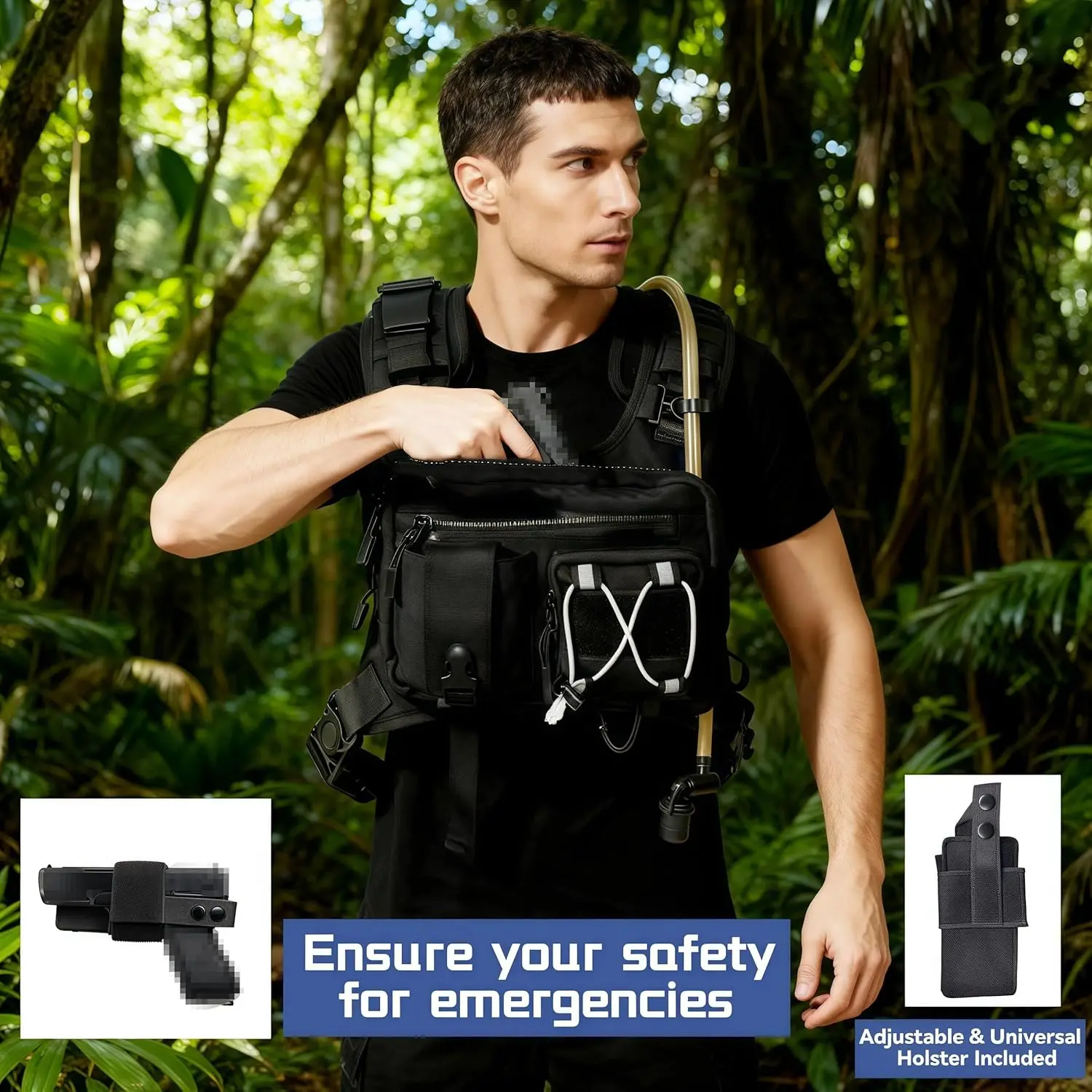 ·【Multifunctional & Comprehensive Bag】 The water bladder ensures moisture needs, the phone pocket ensures you stay in touch, the holster allows you to easily deal with dangerous situations; The front pockets can store your necessary things, the rear backpack allows you to bring T-shirt, helmets, etc.
