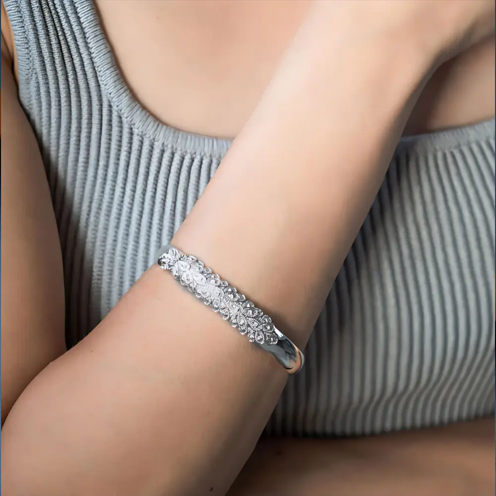 This bracelet is a versatile piece that enhances any outfit. Its elegant design and silver finish make it a standout accessory. Whether for a formal event or a casual outing, this bracelet adds a touch of sophistication. It's a perfect gift for women who appreciate unique and stylish jewelry.