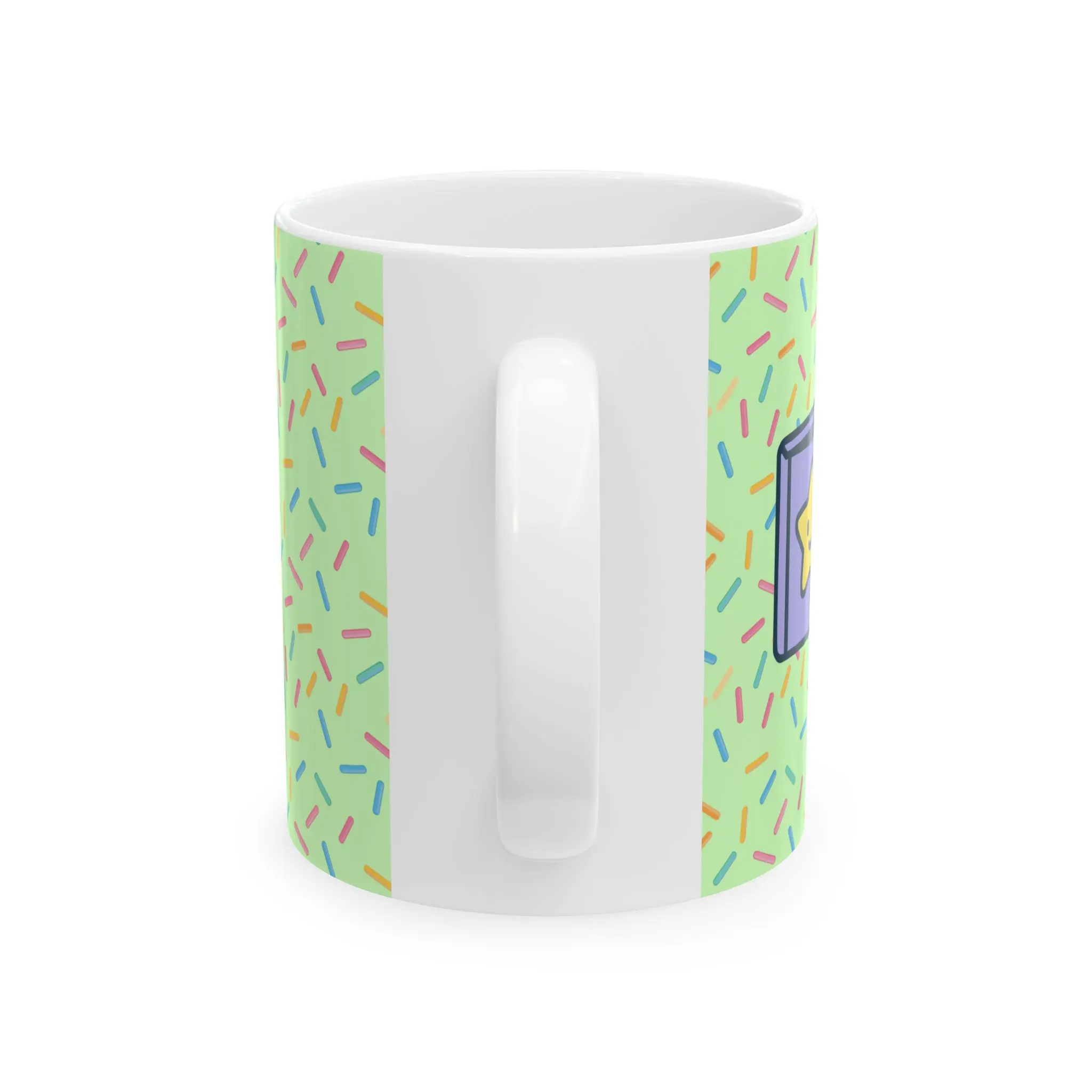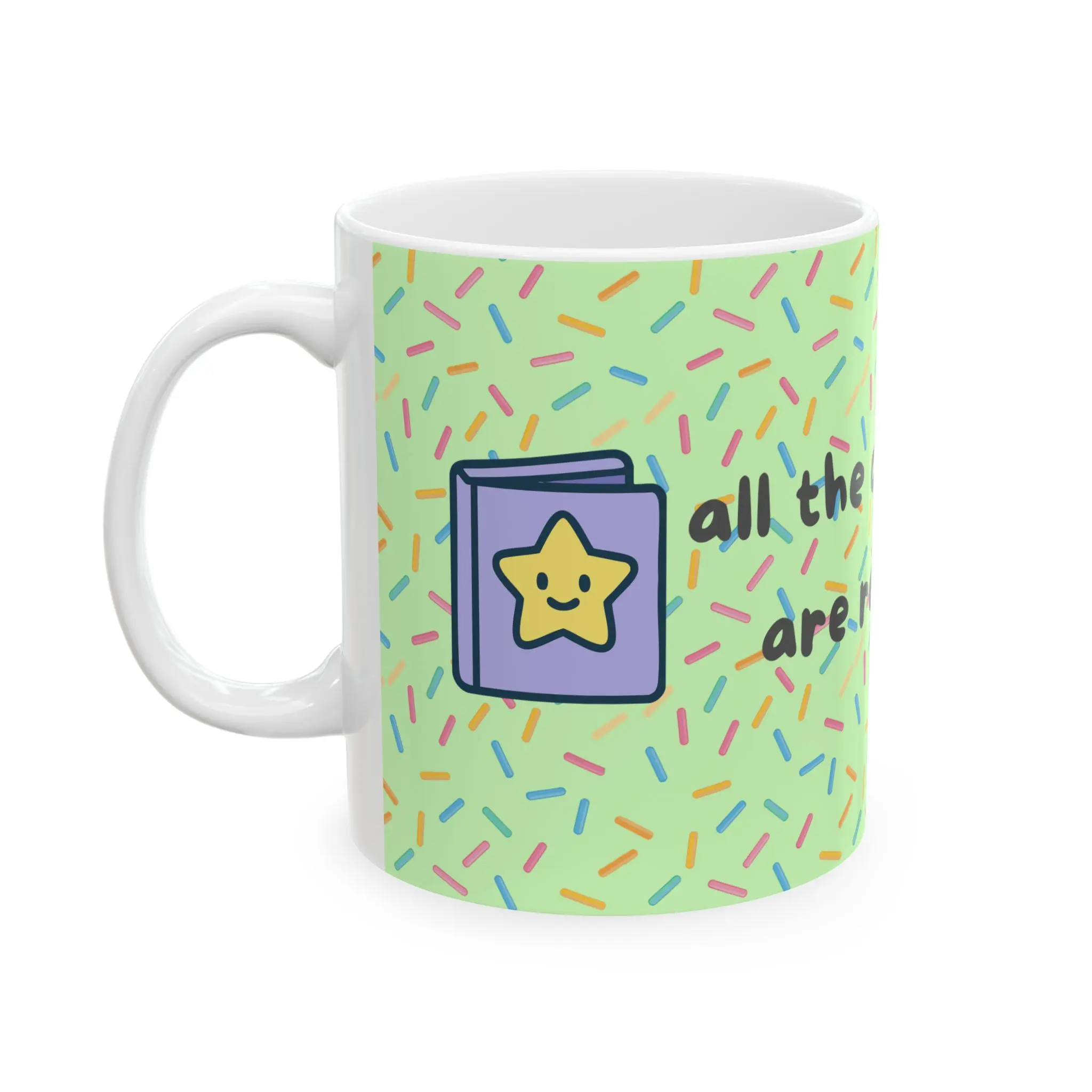 This glossy ceramic mug brings a playful, bookish energy to daily routines. Covered in a light green sprinkle pattern with small illustrated book accents, it reads like a friendly note to readers who celebrate reading as part of who they are. Warm drinks feel brighter in this color-pop design. The comfortable C-handle and two size options let you choose a quick 11oz cup or a heartier 15oz to linger over. Dishwasher- and microwave-safe, lead- and BPA-free, it’s built to be used every morning, at study sessions, or during cozy reading breaks.