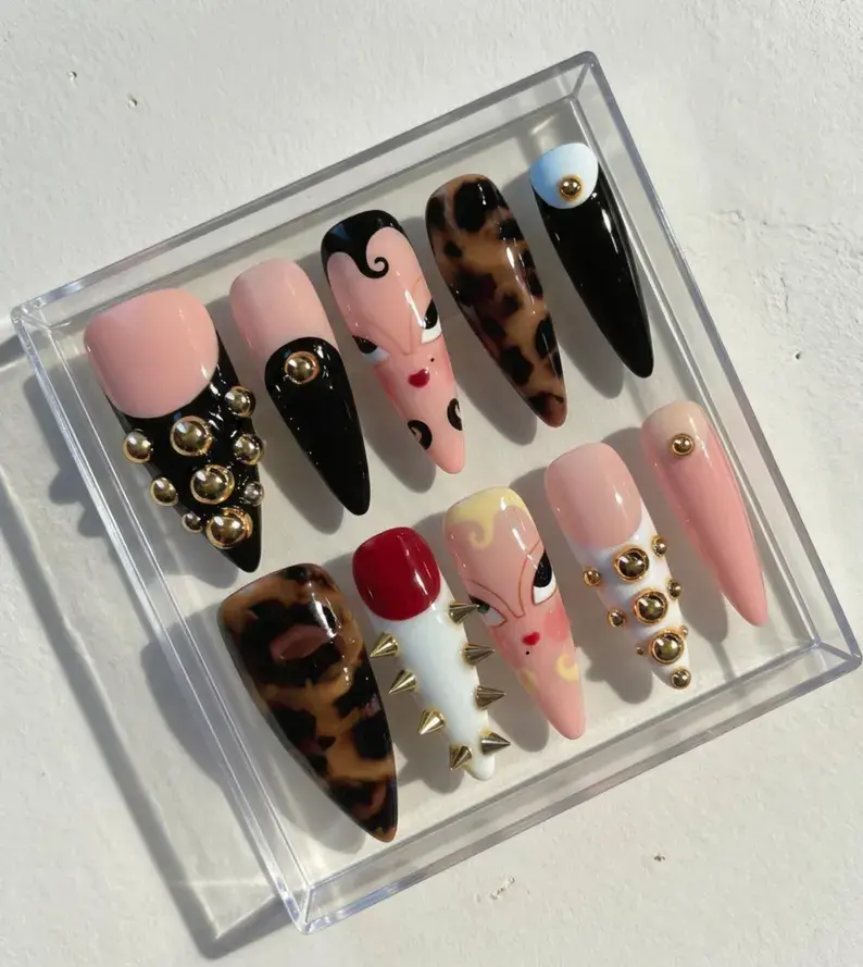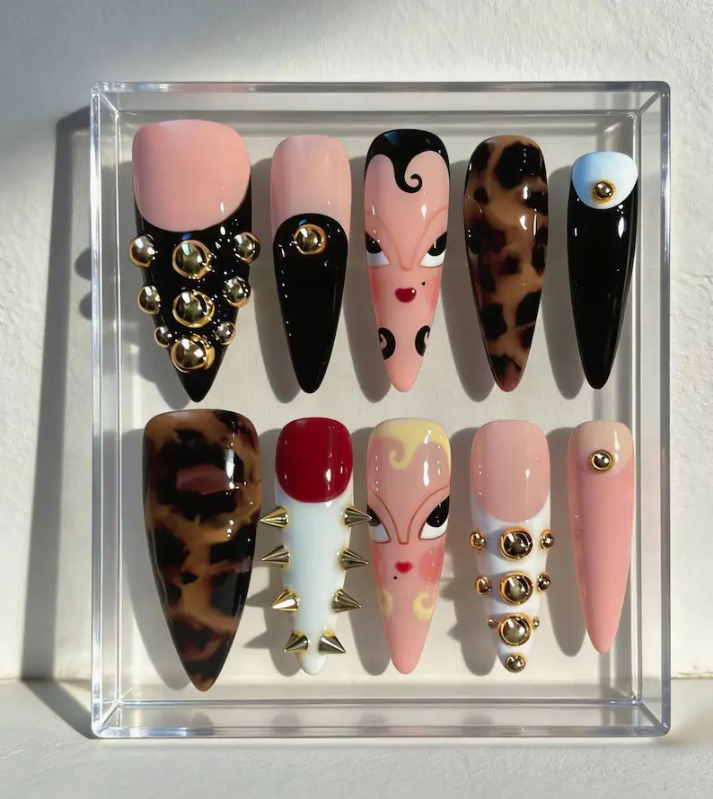 Retro Diva Press On Nails | 3D Gold Stud Nails | Tortoise Shell Glam Nail Art | Handmade Statement Stiletto Set