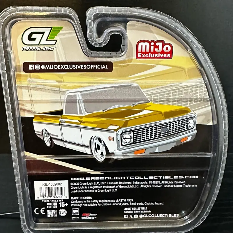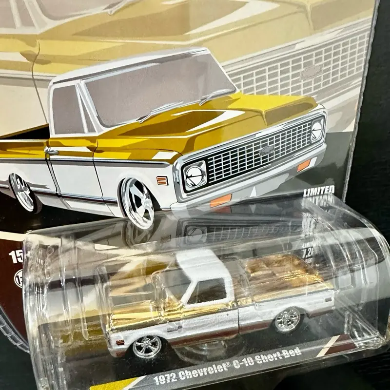 Super chrome chase,Greenlight 1972 Chevrolet C-10 Short Bed Custom Mustard Yellow 1/64,New.