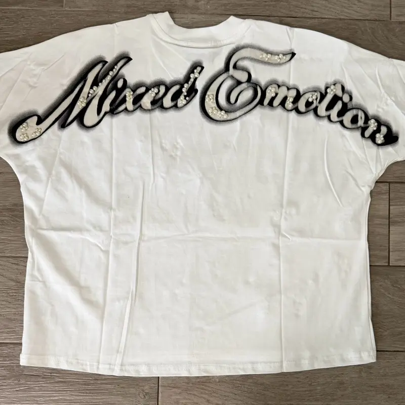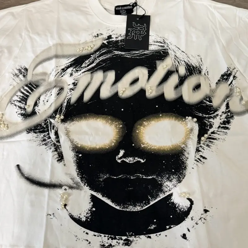 Abstract Face Graphic Oversized Tee with Bold Emotion Design and Unique Pearl Accents