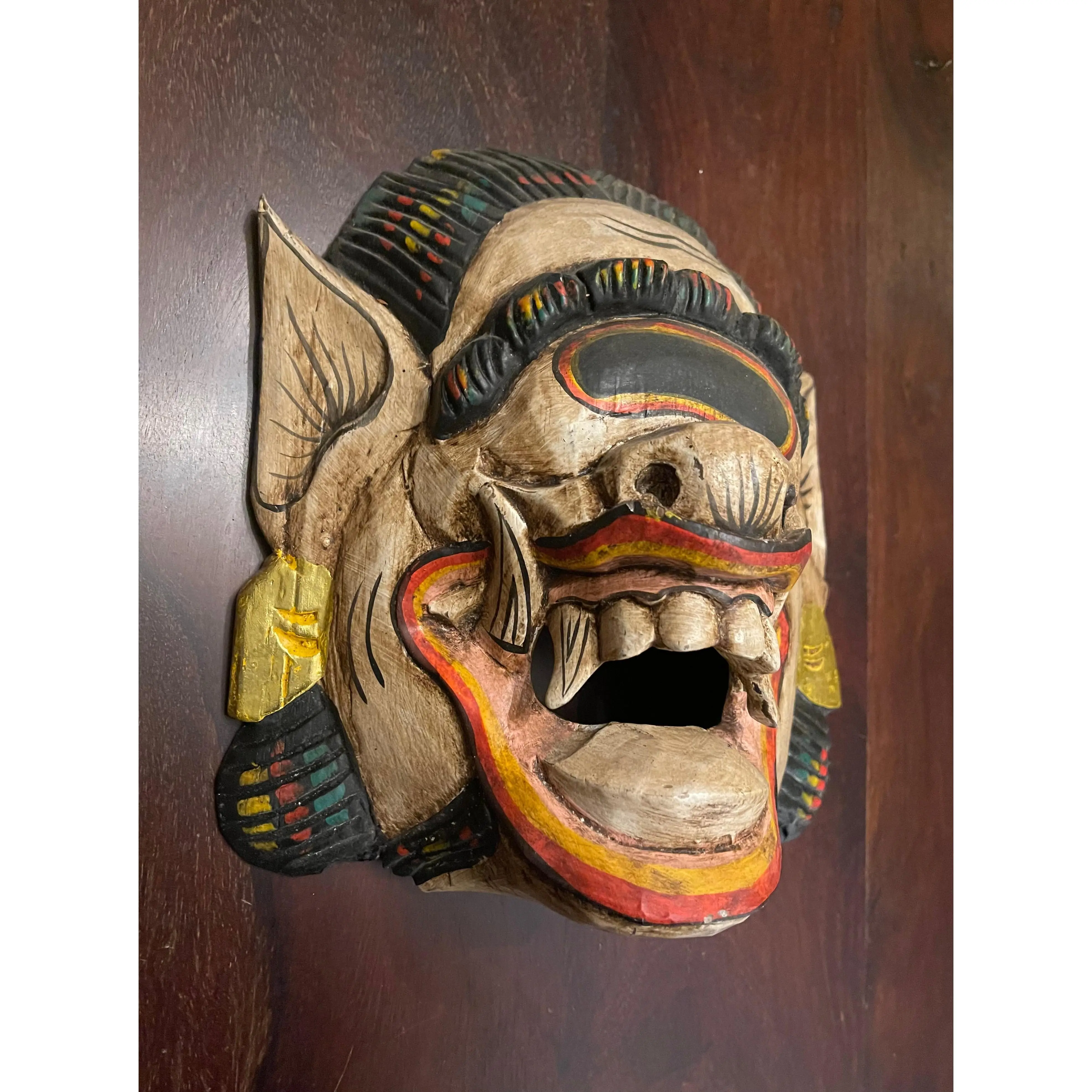A colorful mask made in Bali depicting a color pointy eared, one eyed spirit with a large smile. Made in hardwood and handprinted this creature will protect your house from evil spirits. Dimension: 9" tall x 8" wide.