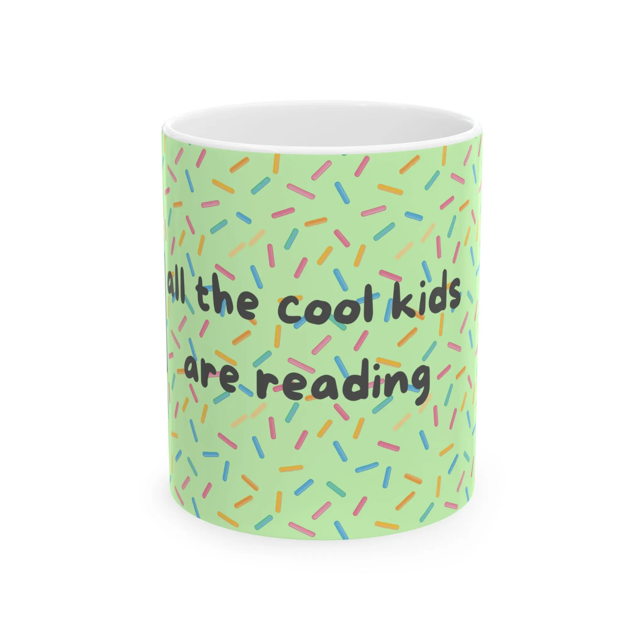 This glossy ceramic mug brings a playful, bookish energy to daily routines. Covered in a light green sprinkle pattern with small illustrated book accents, it reads like a friendly note to readers who celebrate reading as part of who they are. Warm drinks feel brighter in this color-pop design. The comfortable C-handle and two size options let you choose a quick 11oz cup or a heartier 15oz to linger over. Dishwasher- and microwave-safe, lead- and BPA-free, it’s built to be used every morning, at study sessions, or during cozy reading breaks.