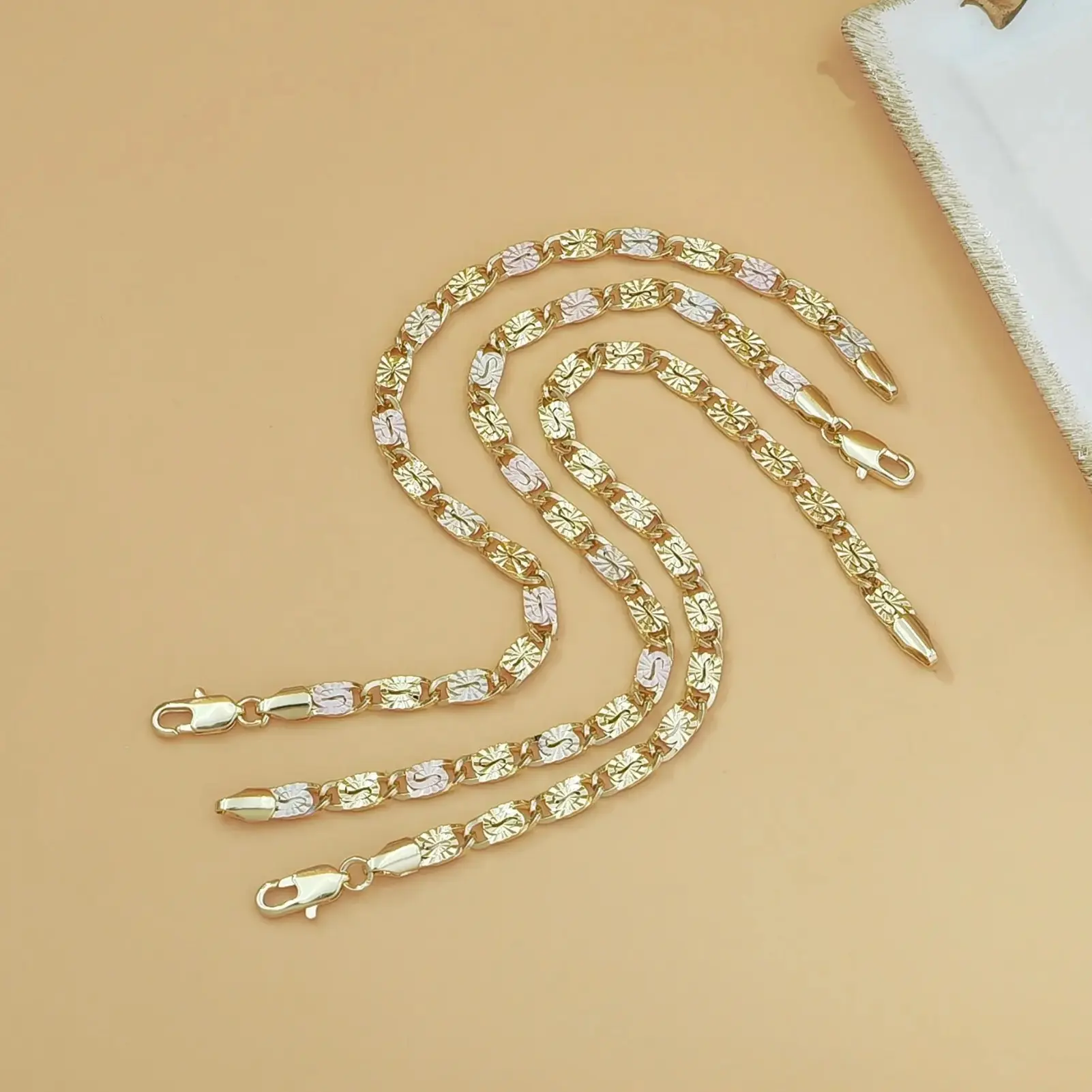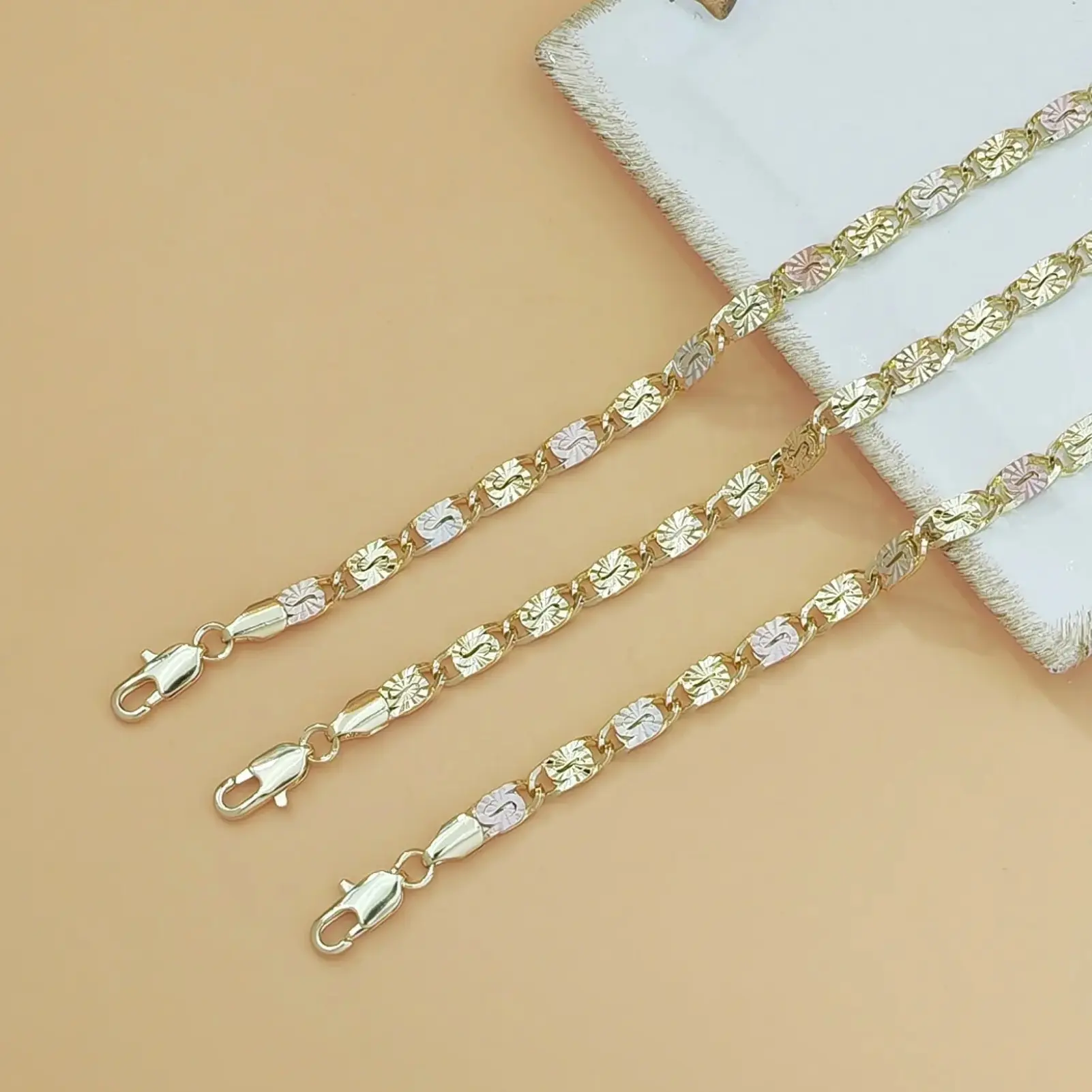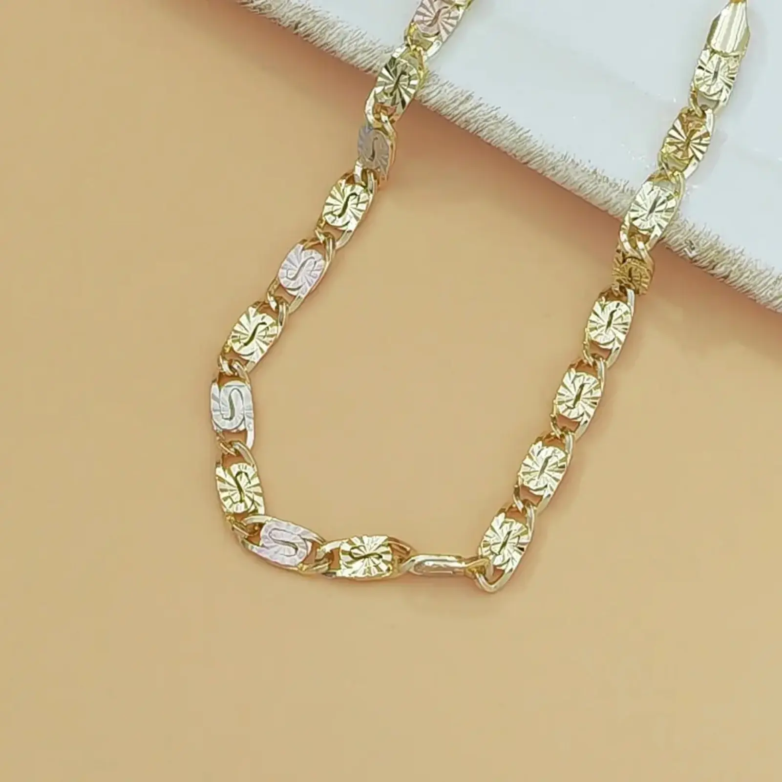 Elegant Tri-Color Bracelet for Women Discover the 1pc 14K Gold Tri-Color Mariner Link Bracelet, perfect for women. This polished floral engraved three-tone gold chain bracelet adds a touch of elegance to any outfit. Ideal as a dainty jewelry gift for her, it combines style with sophistication. Key Features: Material: 14K Gold Design: Tri-Color Mariner Link Engraving: Polished floral design Type: Dainty jewelry gift Perfect Gift Choice This bracelet is a thoughtful gift option. Its elegant design and polished finish make it suitable for various occasions. Give the gift of style and sophistication with this beautiful bracelet.
