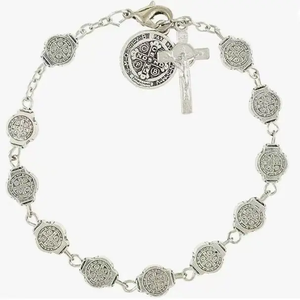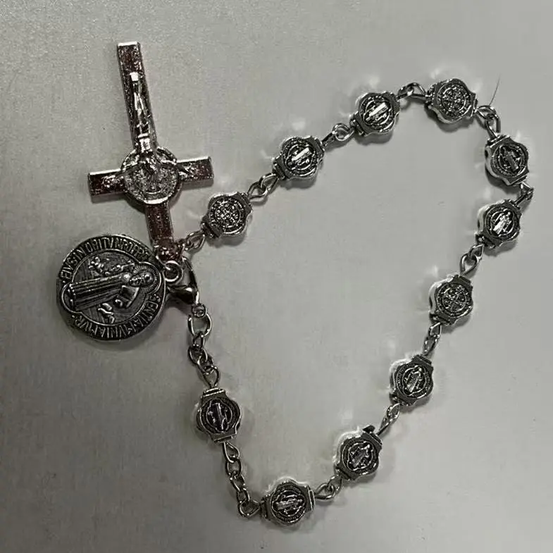 【Divine St. Benedict & Crucifix Design】 A meaningful combination of faith and style. This vintage bracelet features a detailed St. Benedict medal, an engraved round charm, and a high-polish crucifix pendant, creating a sacred rosary-inspired design that symbolizes spiritual strength and protection.
