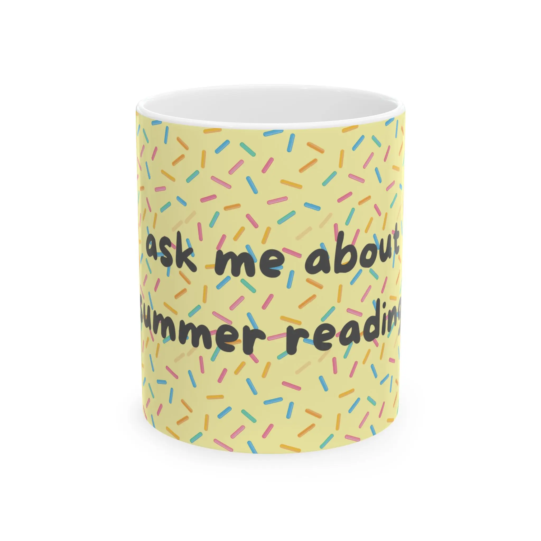 Bright, cheerful ceramic mug that brings a sunny, playful vibe to everyday coffee and tea moments. The glossy white ceramic canvas is wrapped in a pastel-yellow background sprinkled with colorful confetti and a fun handwritten message that invites conversation about summer reading. Lightweight but sturdy, it feels familiar in the hand thanks to a comfortable C-handle and comes in two sizes to match morning routines. use it at your desk, beside your favorite reading nook, or bring it to book club to spark smiles and summer book talk.