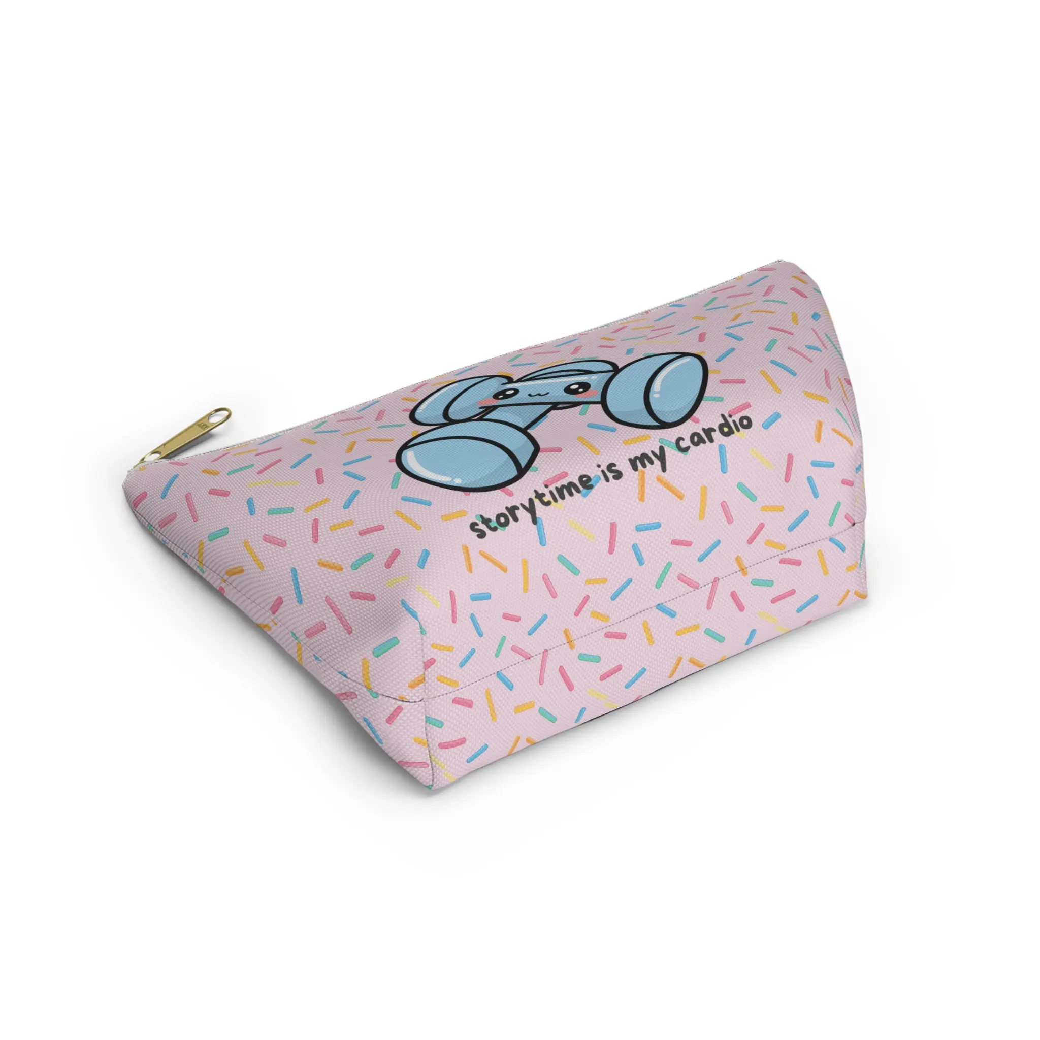 A cheerful accessory pouch that carries your everyday essentials with a playful wink. The t-bottom shape gives it stability on counters and in bags, while the durable spun polyester holds bright, crisp prints that stay vibrant. A gold-color zipper pull adds a little shine, and the non-woven laminate lining gives structure so brushes, chargers, or makeup don’t spill. The pastel sprinkle pattern and smiling dumbbell graphic with the caption “storytime is my cardio” bring lighthearted energy—great for writers, fitness fans who love reading, or anyone who appreciates cute, quirky style. Sized to fit small daily items and assembled with quality materials from international sources.