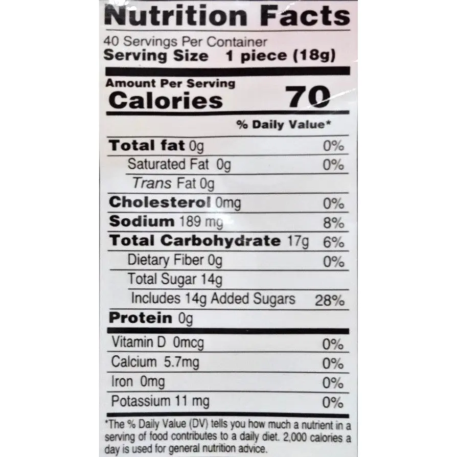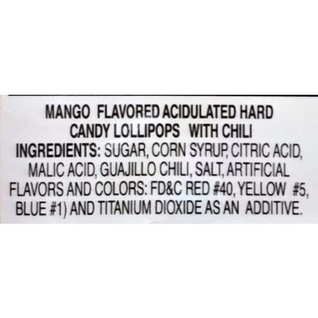 Chili,mango,sugar,corn syrup,maltodextrin,citric acid,salt chili,titanium dioxide,artificial flavor,yellow color,red color