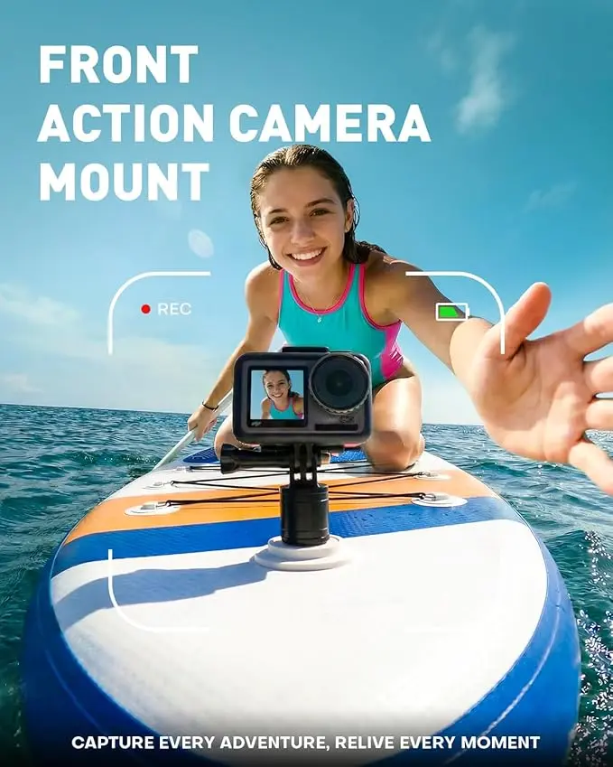 ·【Capture the Highlights & Carry You Far】This paddle board features a professional-grade camera mount at the golden ratio point for stable shooting with mainstream action cameras. Ten high-strength D-rings allow you to secure gear, attach safety lines, or mount fishing rods—creating a robust platform for any adventure. Whether on calm lakes or coastal waters, this SUP lets you navigate with confidence.