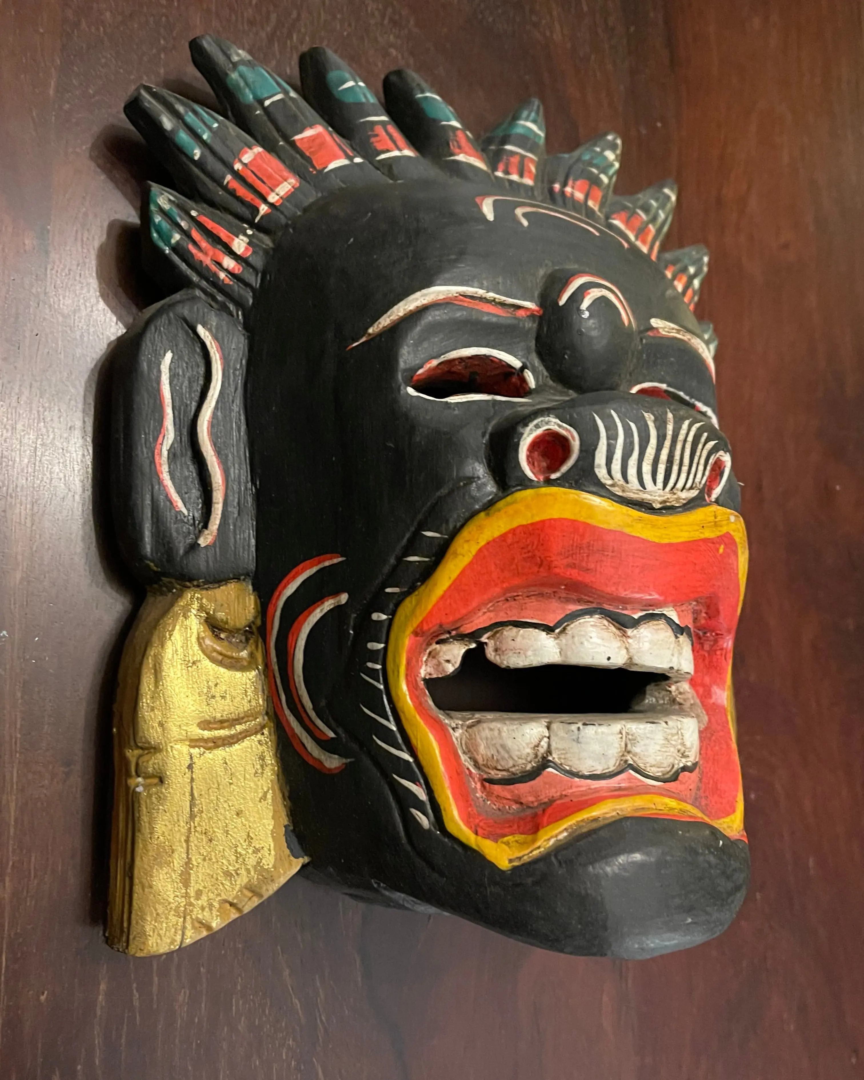 A colorful wooden mask made in Bali. This is the grinning monkey god handprinted in great detail. This mask will put any visitor to your home in a cheerful mood. Dimensions: 9" tall x 8" wide.