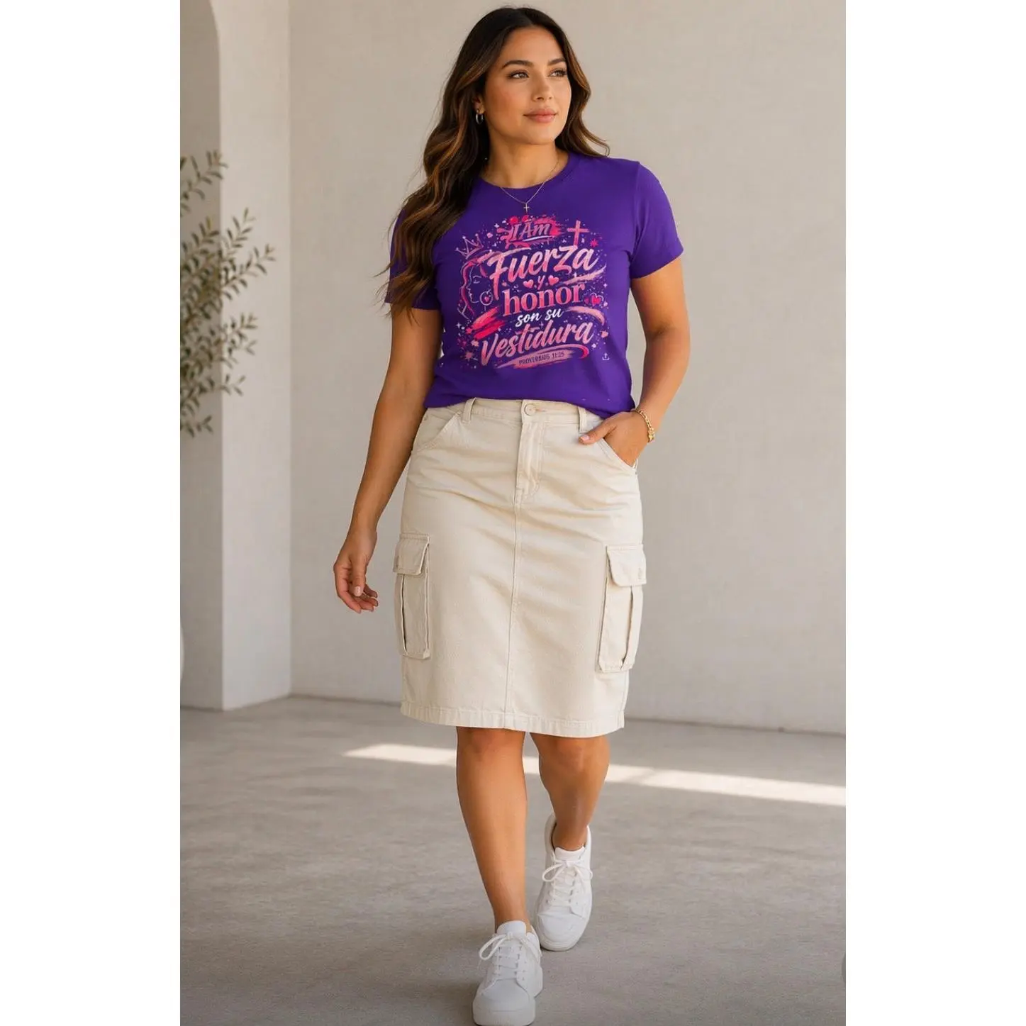 Bold, feminine, and full of purpose — this piece speaks strength without saying a word. Inspired by Proverbios 31:25, this design represents a woman who walks in confidence, dignity, and faith.