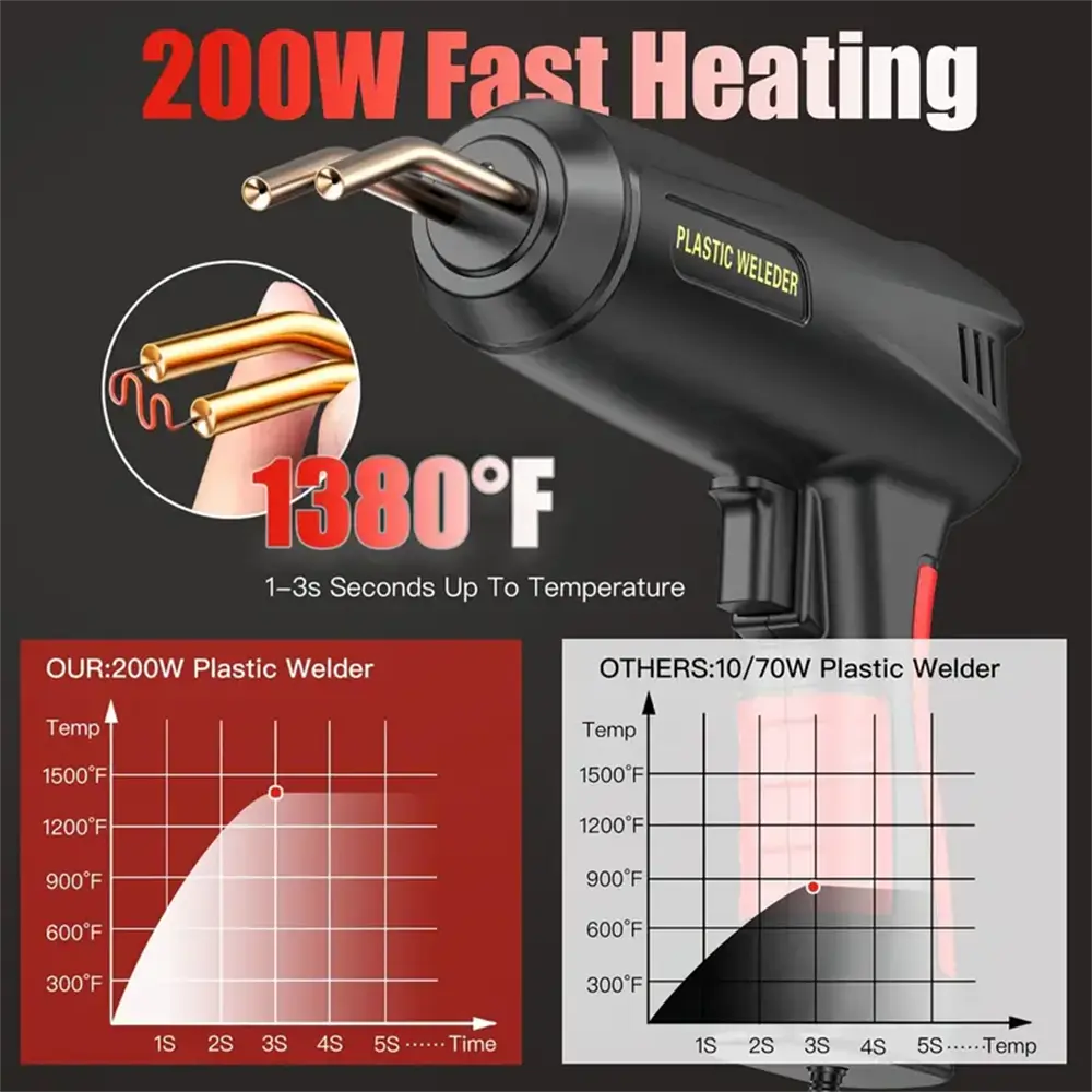 【Upgraded Multipurpose 200W Plastic Welding Repair Kit】Quick Heating Plastic Welder Gun ,save Your Time Effectively. The Tool Is Indispensable For You To Repairing Most Modern Products Which Are Made Of Plastics.such As Car Bumper, Bumper, Dashboard, Lamp Holder, Plastic Ring, Kayaks, Headlights And Many Other Plastics. Also Perfect For Handicraft.