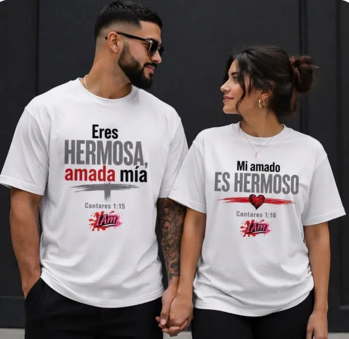 A bold expression of love inspired by Scripture. This men’s tee features “Eres hermosa, amada mía” from Cantares 1:15, designed to speak strength, devotion, and admiration.