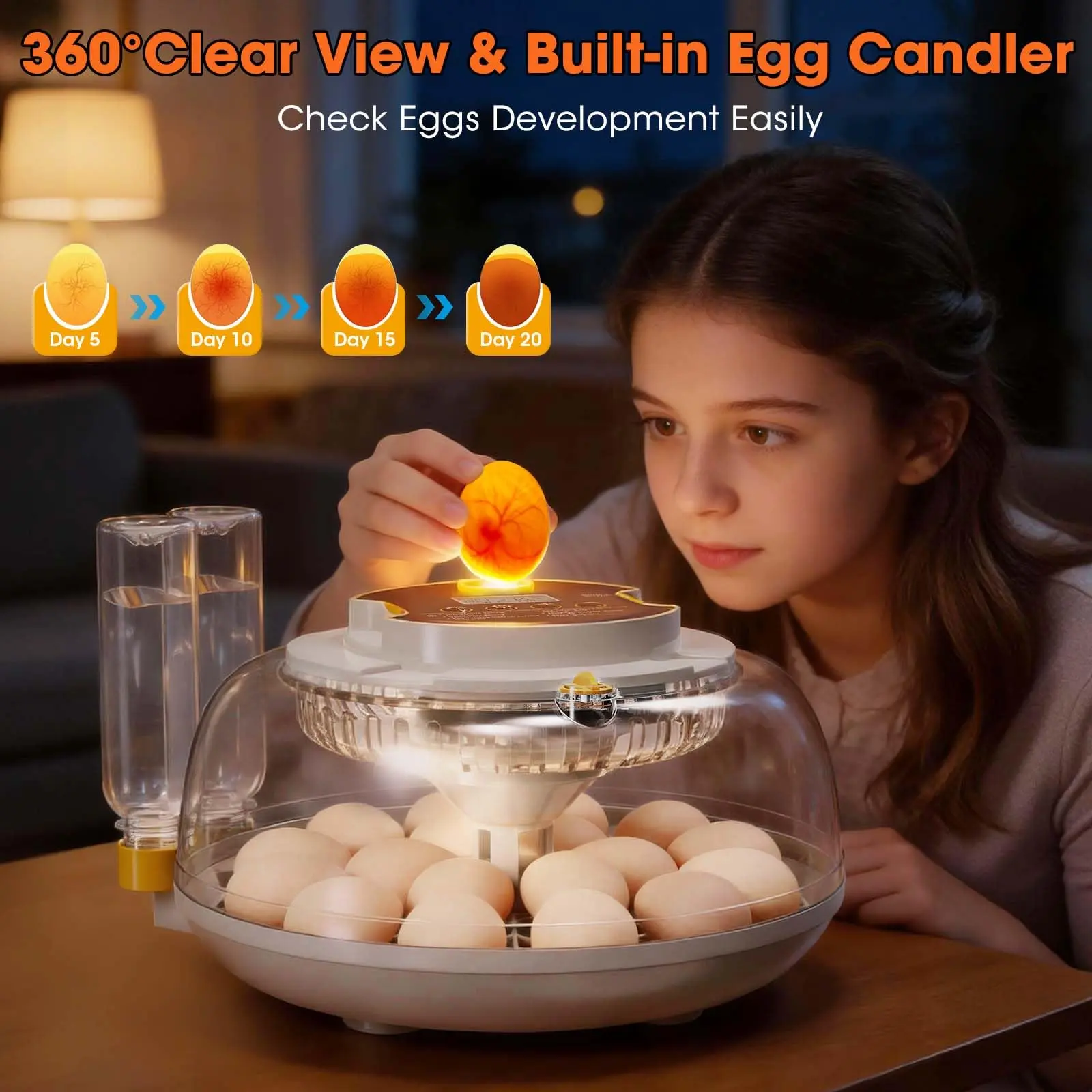 18 Egg Incubator with Automatic Egg Turning & Humidity Control, Built-in Egg Candler, 360° View Window & Dual-Size Trays for Chicken, Duck, Quail, Goose Eggs – Ideal for Farm, Classroom, Home Kitchen