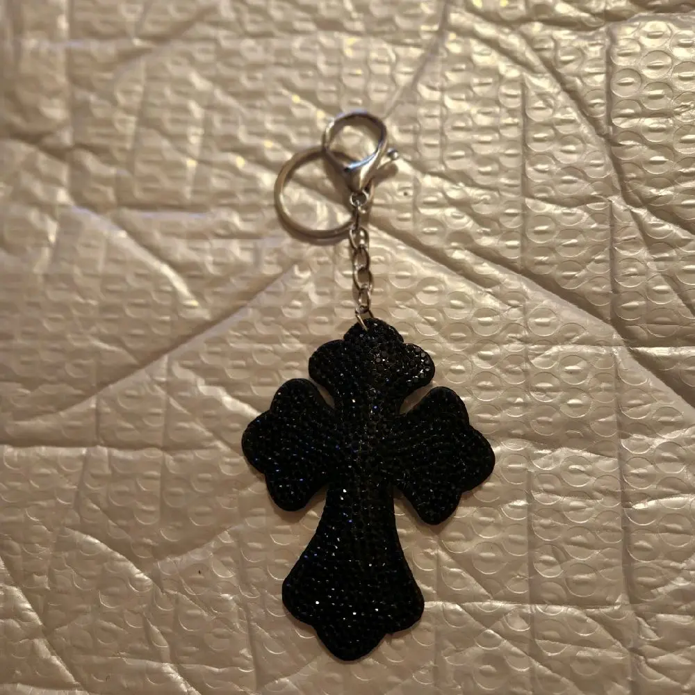 ·Black Cross Keychain: This stylish accessory features a sleek black cross design. Perfect for adding a touch of elegance to your keys or bags. The cross is complemented by a silver chain and ring, enhancing its decorative appeal.