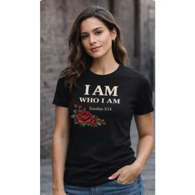 Inspired by Exodus 3:14, “I AM WHO I AM,” this design blends bold truth with refined elegance. Featuring a luxury-style serif font and soft floral detail, it represents strength, identity, and unwavering faith.