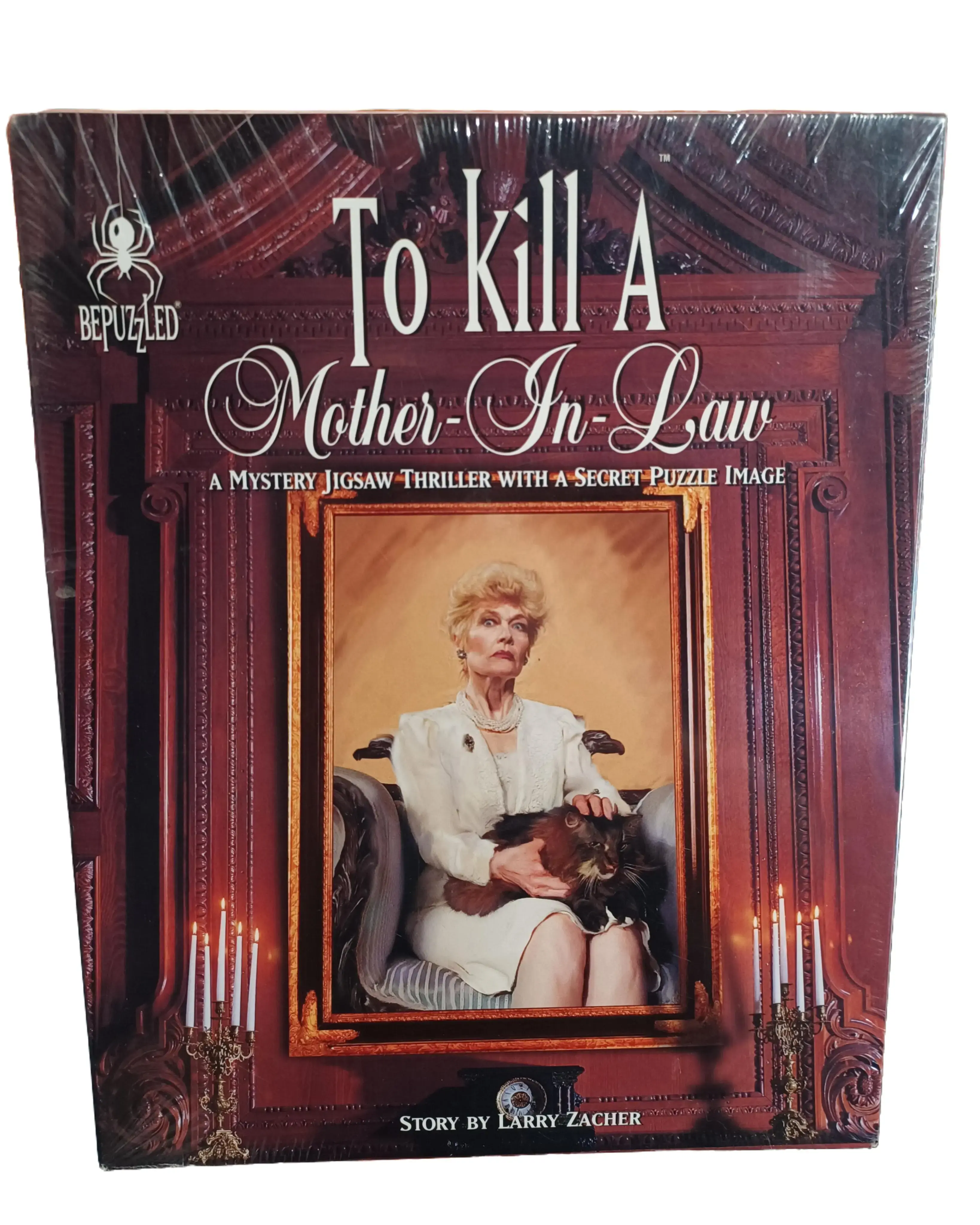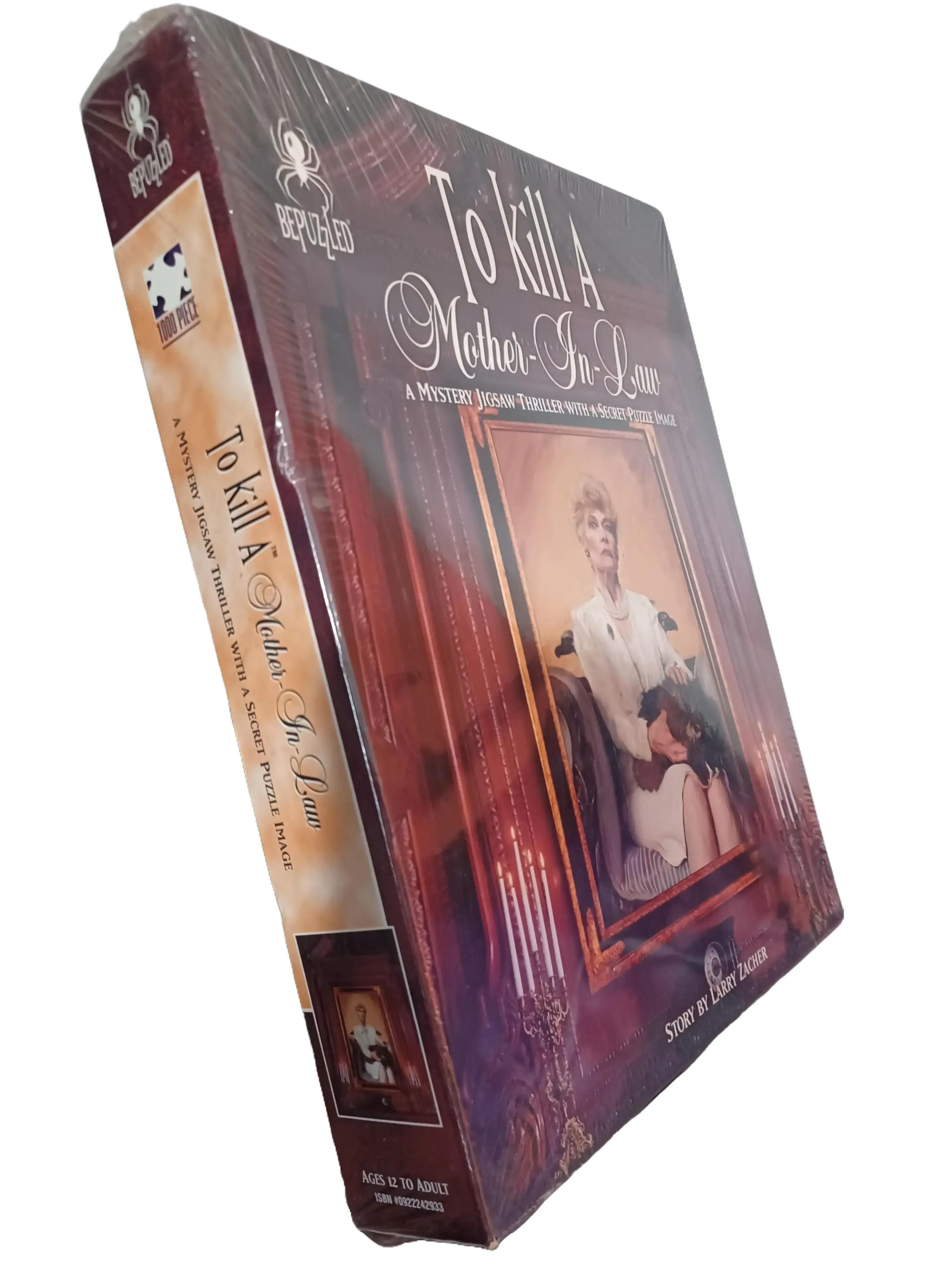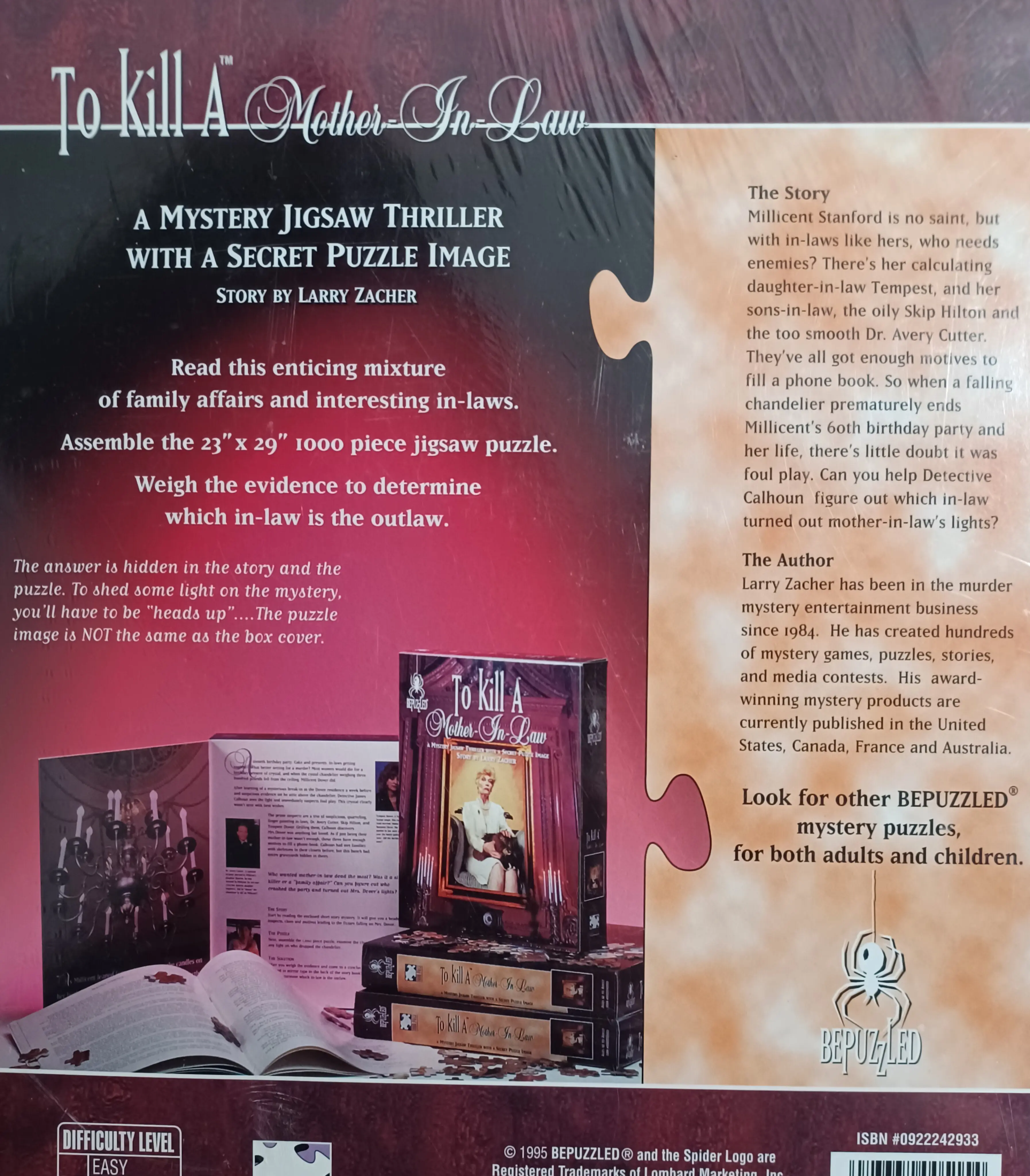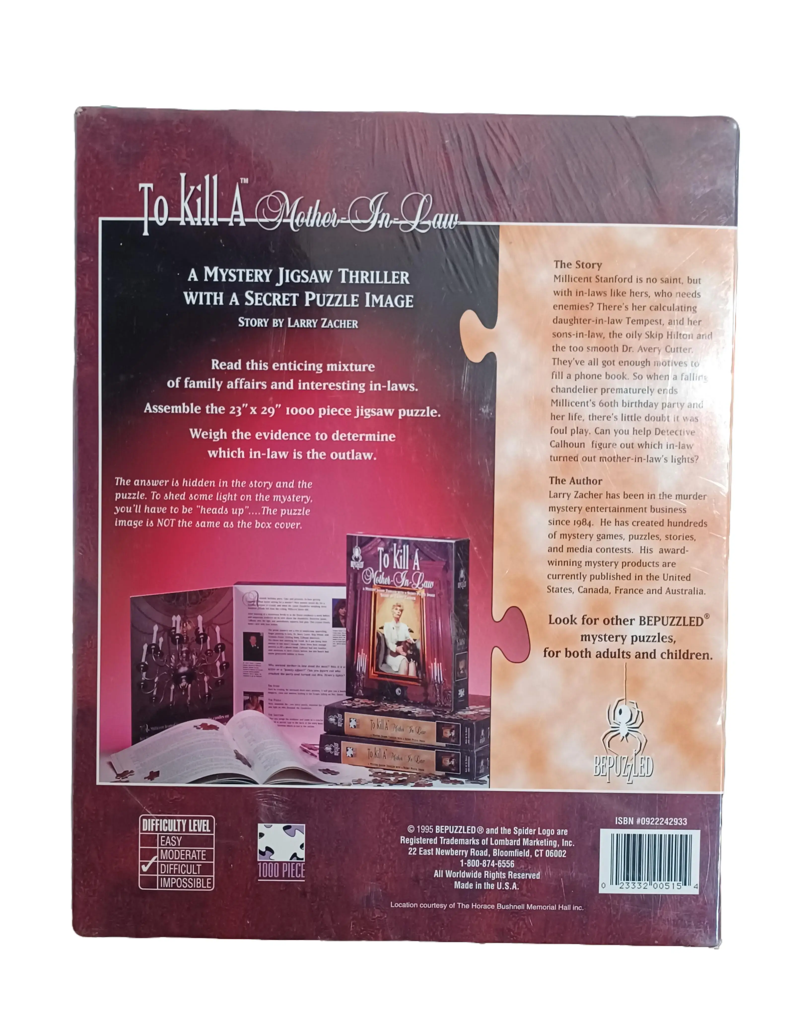 To Kill a Mother-In-Law" is a 1995/1993 BePuzzled mystery jigsaw thriller featuring 1000 pieces. Users read a story about Millicent Stanford's murder and assemble the 23" x 29" puzzle to find clues. The final puzzle image differs from the box art, requiring players to identify the guilty in-law.Key Product Details:Brand: BePuzzled (Mystery Jigsaw Thriller)Theme: Murder mystery ("To Kill a Mother-In-Law")Pieces: 1000Dimensions: Approximately 23" x 29"Author: Larry ZacherDifficulty: Rated difficultRecommended Age: 12+Key Features:Secret Image: The final puzzle image is not the same as the image on the box cover.Gameplay: First read the story, then assemble the puzzle to find clues.Objective: Identify the killer from clues in the story and the assembled puzzle.