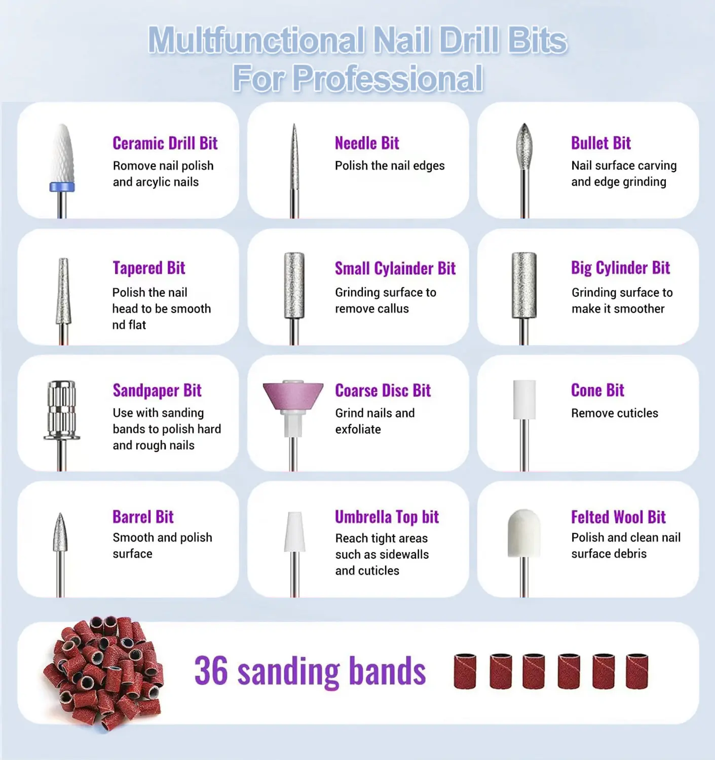 Includes 14 stainless steel bits made from durable sapphire and felt. 36 sanding bands for grinding, filing, shaping, cutting, polishing nails, smoothing corns, calluses, and removing acrylics, gel polish, cuticles. Ideal for thick toenails, smoothing corns, trimming, filing, and polishing natural, thick, and brittle nails.