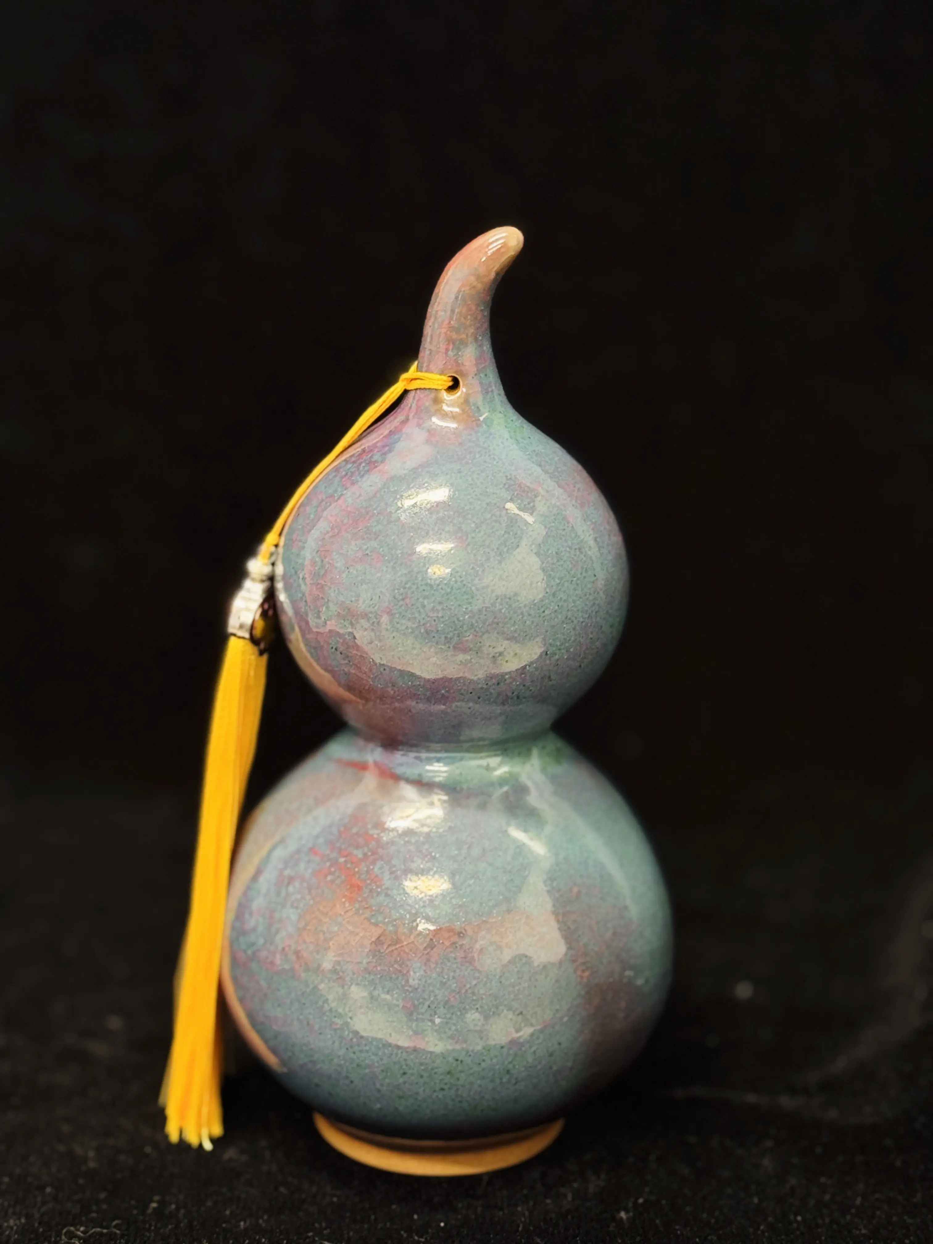 This unique vase is a masterpiece of traditional craftsmanship. Crafted from Jun porcelain, it features a gourd shape that exudes timeless charm. The vintage kiln-fired glaze adds a touch of antiquity, making it a standout piece. Perfect for home decor, it brings a piece of Asian art into your space. The tassel detail enhances its aesthetic appeal. Ideal for those who appreciate cultural artifacts.