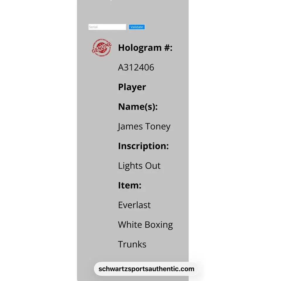 James Toney Signed Everlast White Boxing Trunks – “Lights Out” Inscription (Schwartz Sports COA + Hologram)