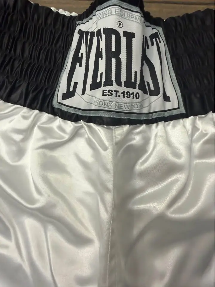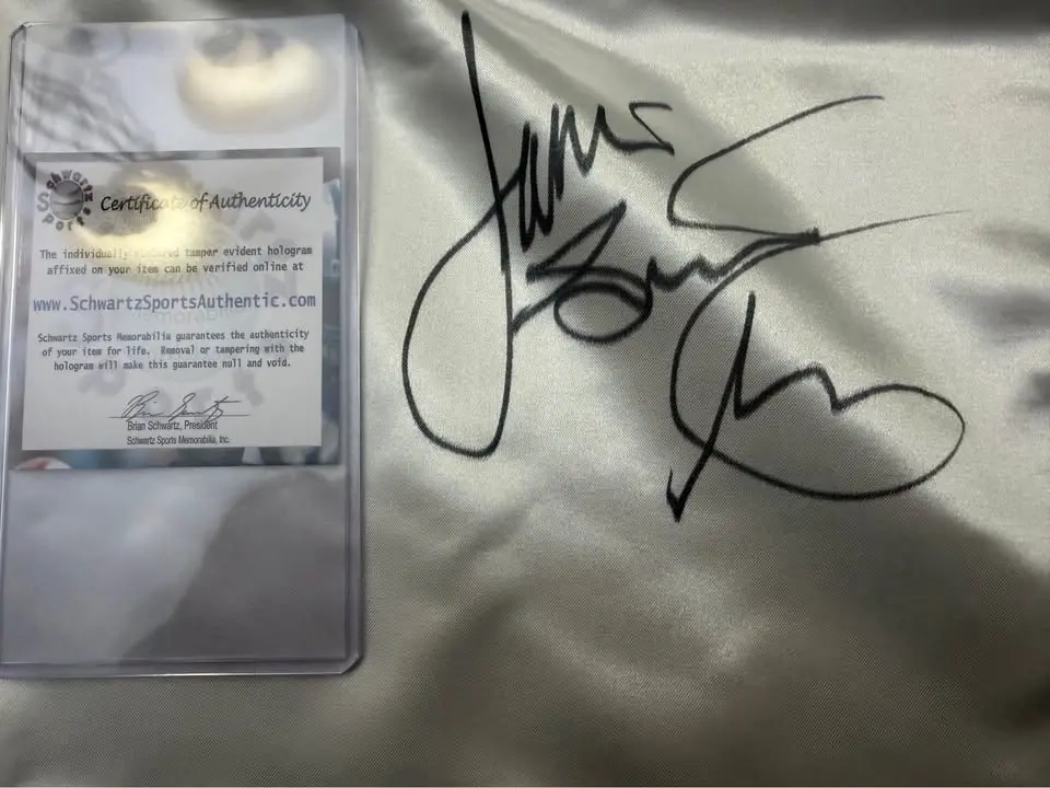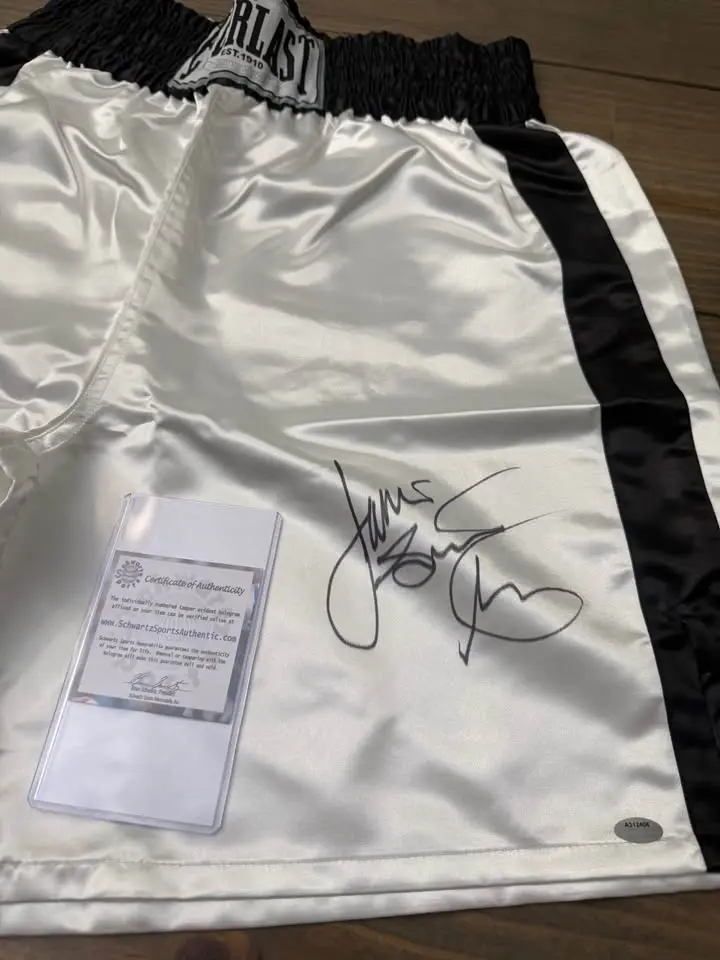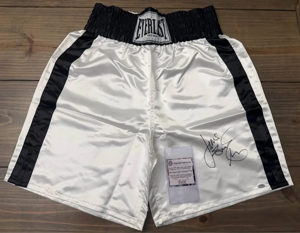 Up for sale is a hand-signed pair of Everlast white boxing trunks autographed by boxing legend James “Lights Out” Toney.