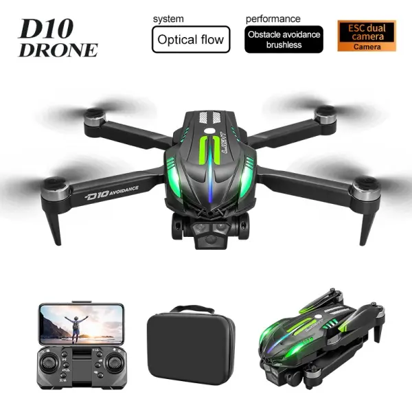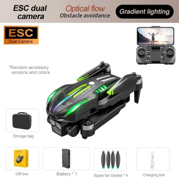 This 2.4G foldable drone combines cool sports car styling, gradient flowing LED lights, and professional aerial functions. It is equipped with brushless motors, 4-way omnidirectional obstacle avoidance, optical flow positioning, and a servo gimbal with EIS anti-shake. The dual-lens WIFI FPV system, gesture control, custom flight routes, and long endurance make it perfect for young players and aerial photography lovers.