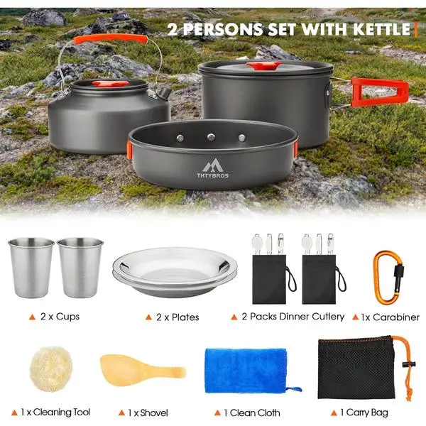 ·CAMPING COOKWARE SET: THTYBROS Camping Cookware Set includes: 1.70L(0.45gal) pot +1.15L(0.30gal) kettle + 7 inch frying pan, 2 x 200ml(0.05gal) stainless steel cups, 2 stainless steel plates, 2 sets of dinner cutleries (2 x forks, 2 x knives, 2 x spoons with 2 storage bags), 1 x bamboo spoon 1 x cleaning cloth 1 x cleaning ball 1 x carrying bag.