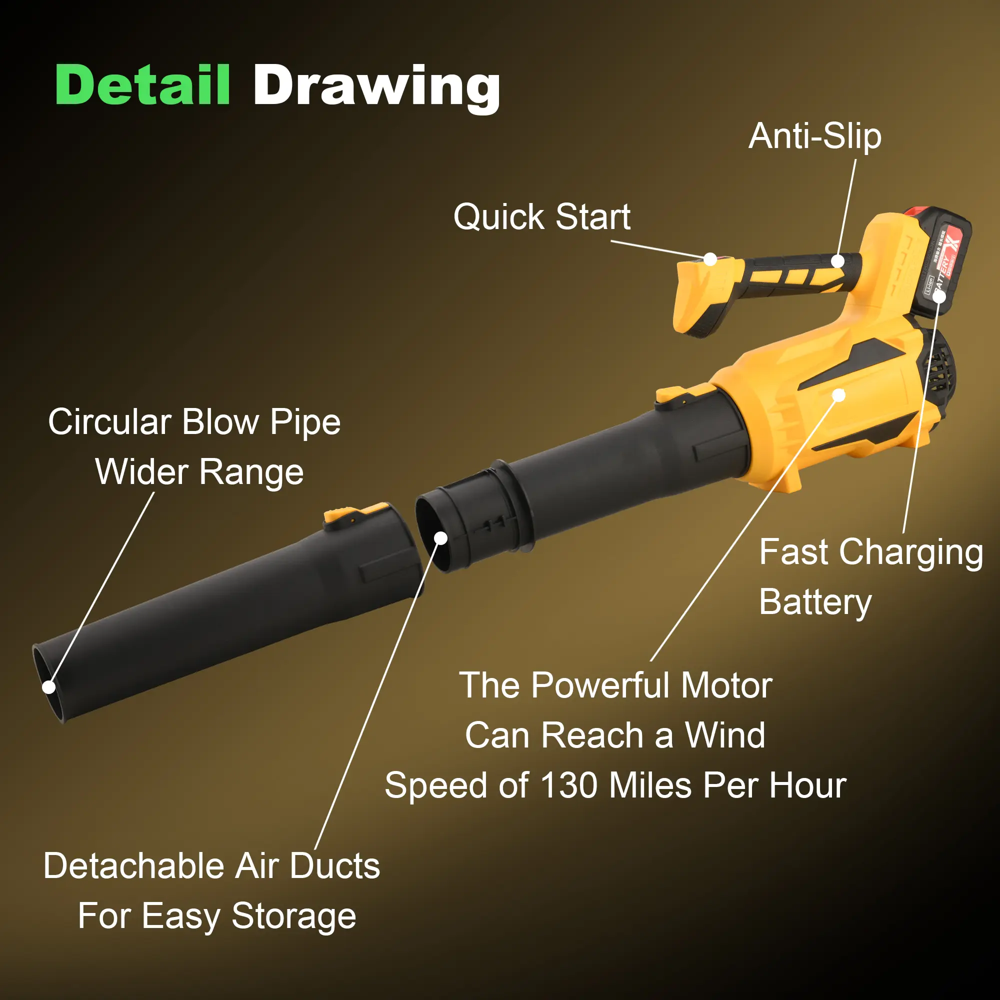 Superior Air Blowing Performance: Our vane blowers are designed with advanced turbine technology and axial fans to maximize airflow output. Delivering an impressive air volume of up to 650CFM through a conical nozzle, the Leaf Blower Cordless is highly effective at clearing large piles of leaves and debris.