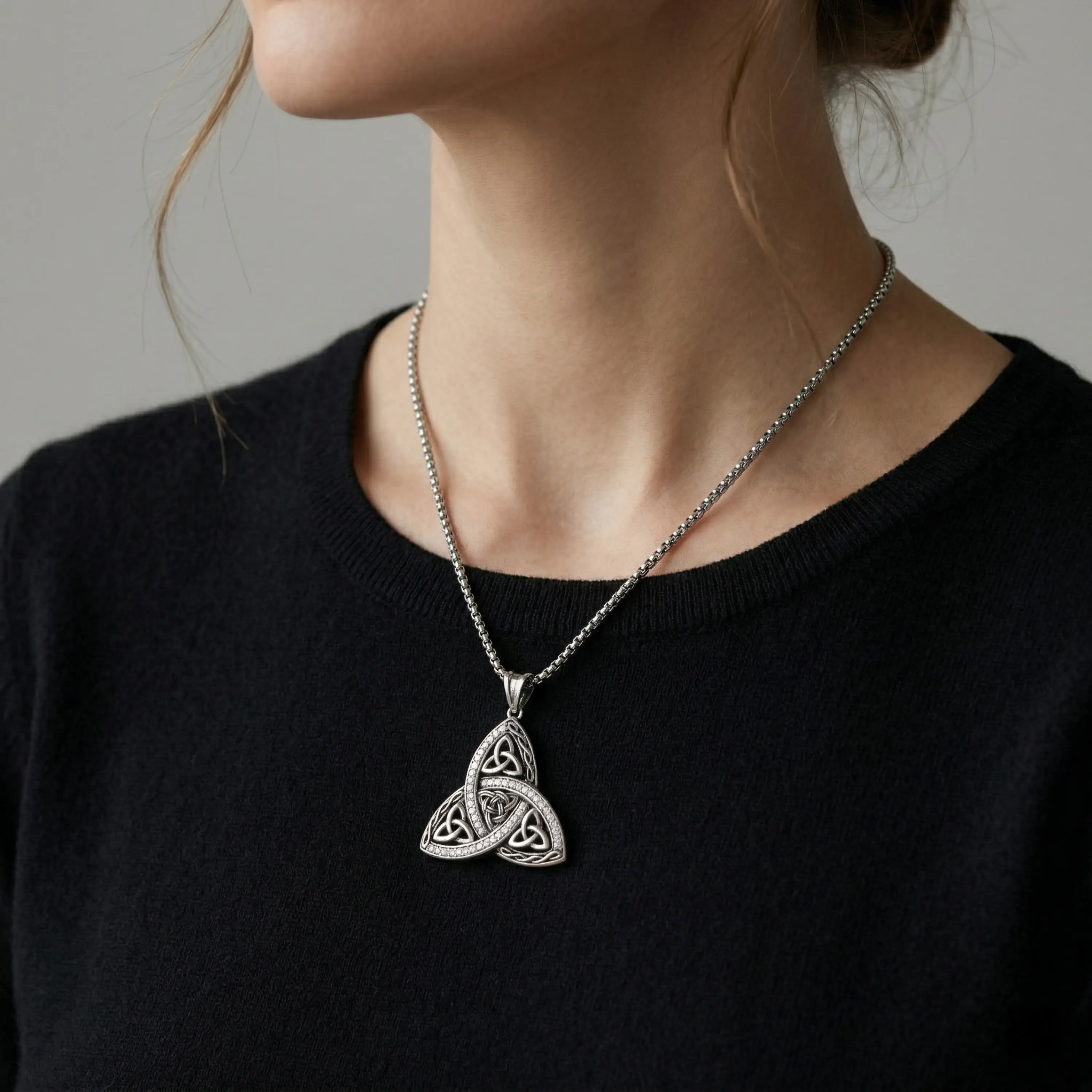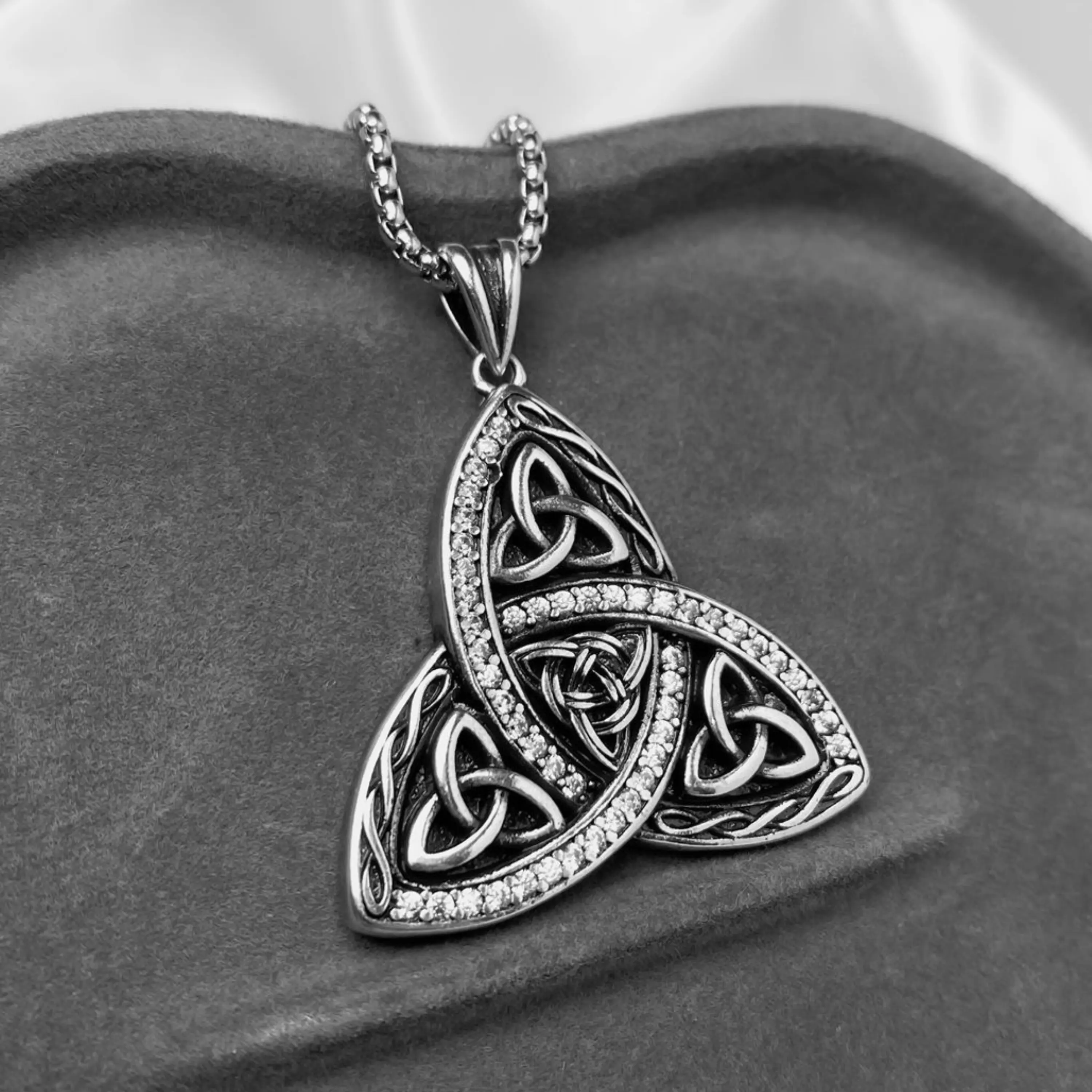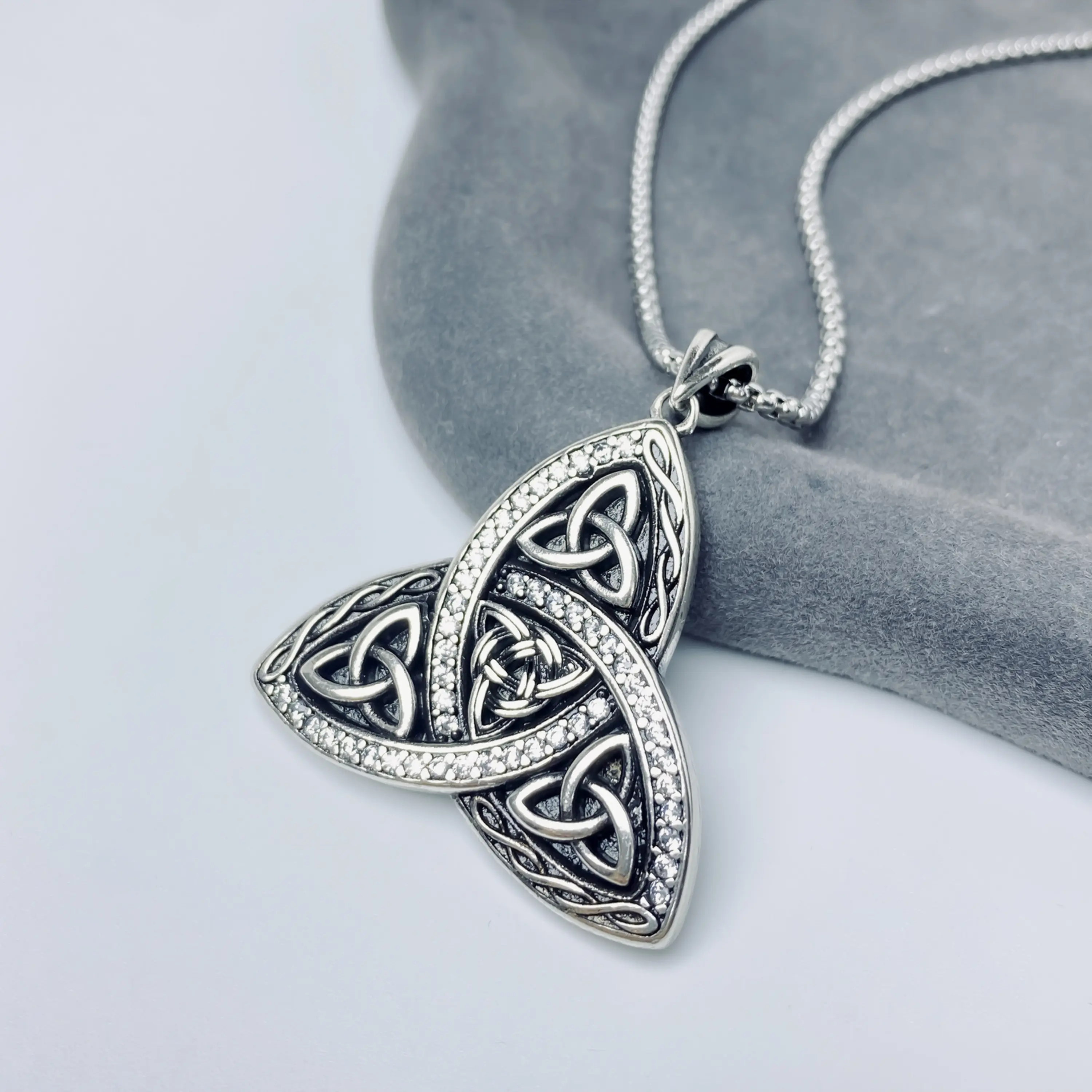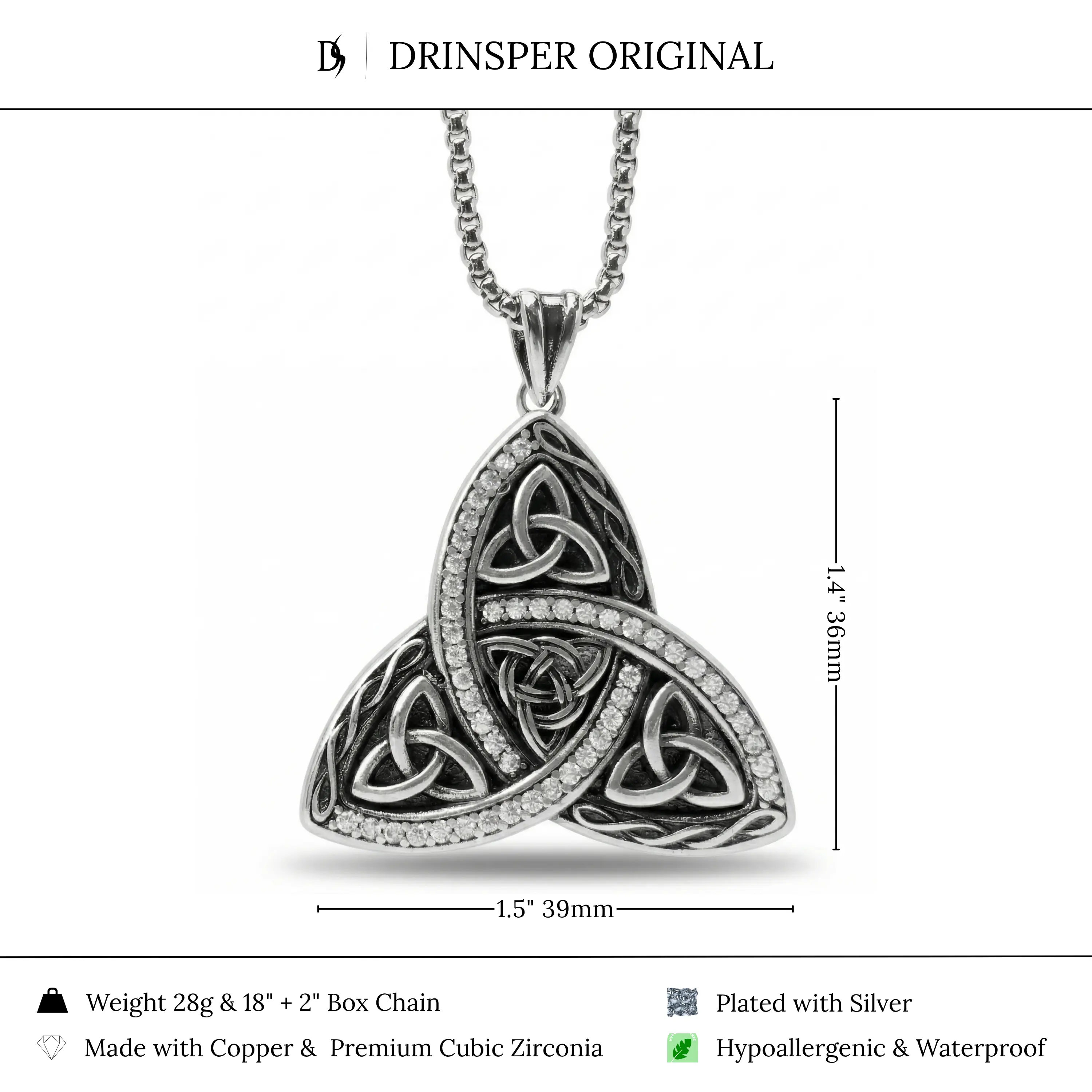 ·A vintage-inspired statement necklace featuring an intricate Celtic knot pendant with a sparkling cubic zirconia border. Made from copper, plated with silver, and paired with an 18" + 2" box chain, it is designed for women who like symbolic, vintage-style jewelry for daily wear and special occasions.