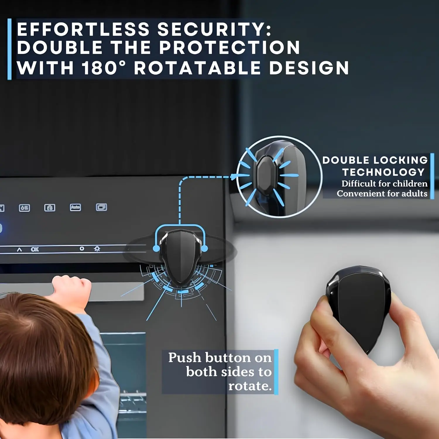 ·The oven baby proof lock can protect your curious little baby from accidental scalds. The baby proof oven lock can rotate freely 180°. Press and hold the two buttons and rotate 90° to unlock, and push it back to the original position to lock