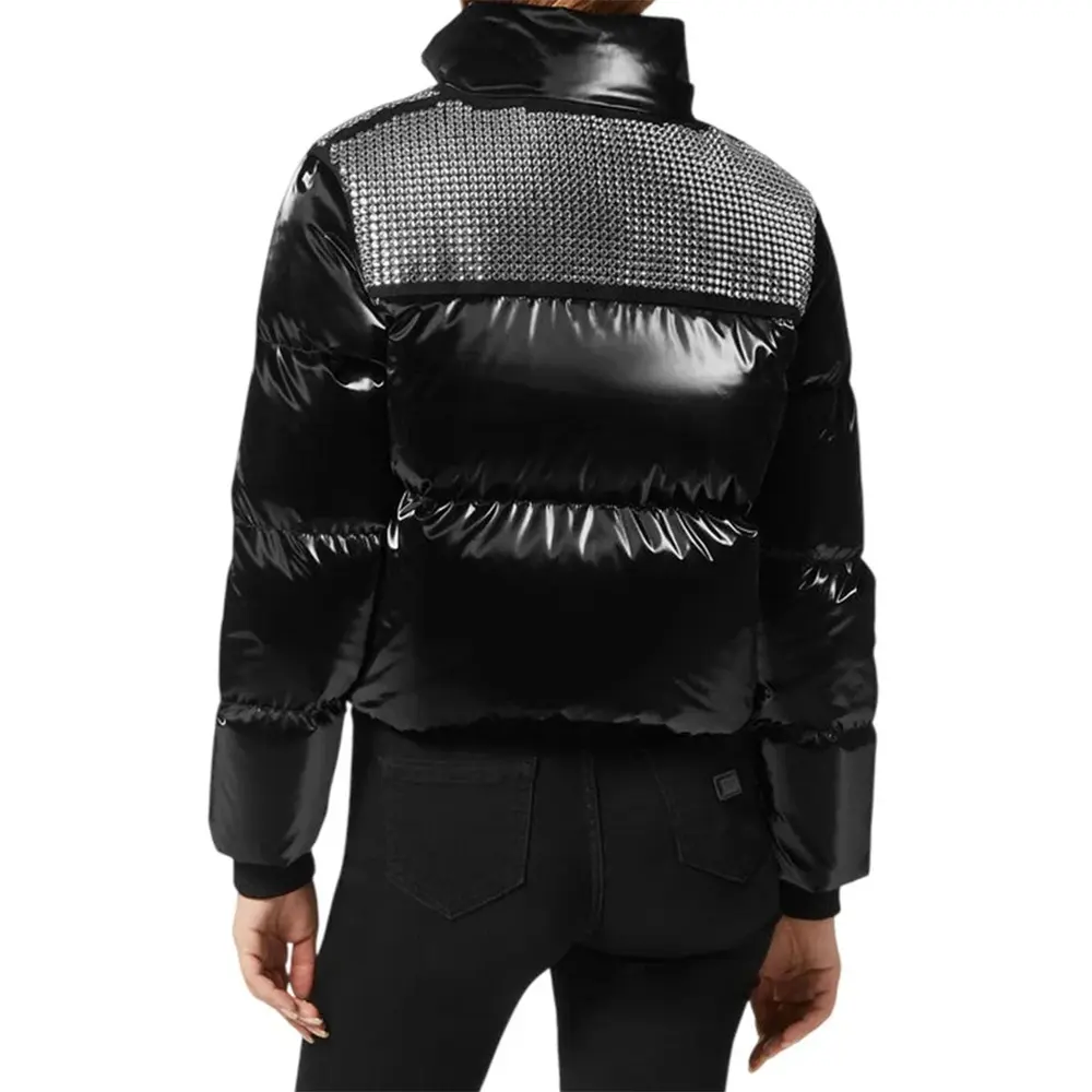 Women Crystal Embellished Glossy Nylon Puffer Jacket by Hide Crafts