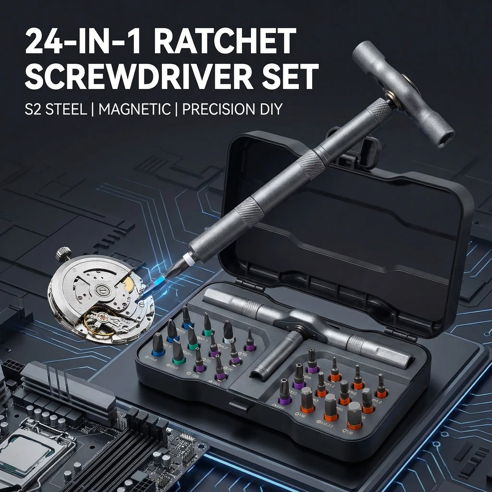 24-in-1 S2 Steel Magnetic Ratchet Screwdriver Set, Portable Hard Case Precision Tool for DIY, Home, Bike, PC & Watch Repairs