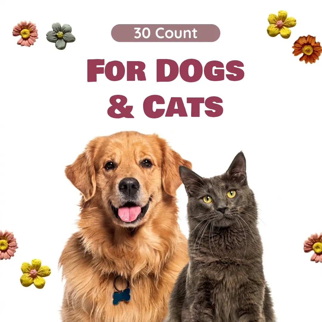 Benji & Louie Goat Milk Blossom Bites are thoughtfully made for both dogs and cats, combining simple ingredients with a playful flower shape that makes every snack moment extra special. Each bite is crafted with real goat milk and chicken, then finished with a touch of fruit and veggie powder for a naturally colorful, wholesome look.