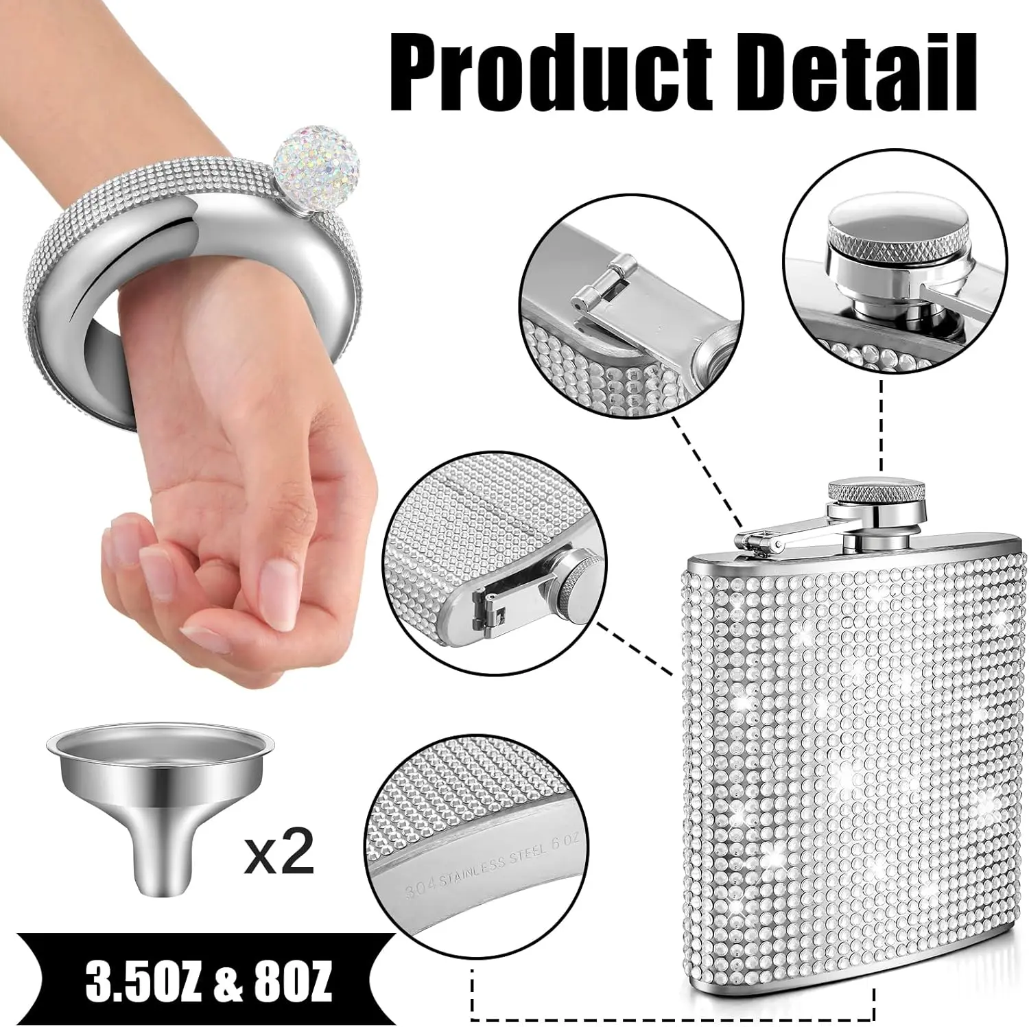 ·Delicate Water Bottle Set: you will receive 2 pieces of shiny diamond hidden bottles for women and 2 pieces of funnels, and they come in 2 designs including 1 bangle bracelet hip bottle and 1 square stylish bottle, convenient for daily use and replacement