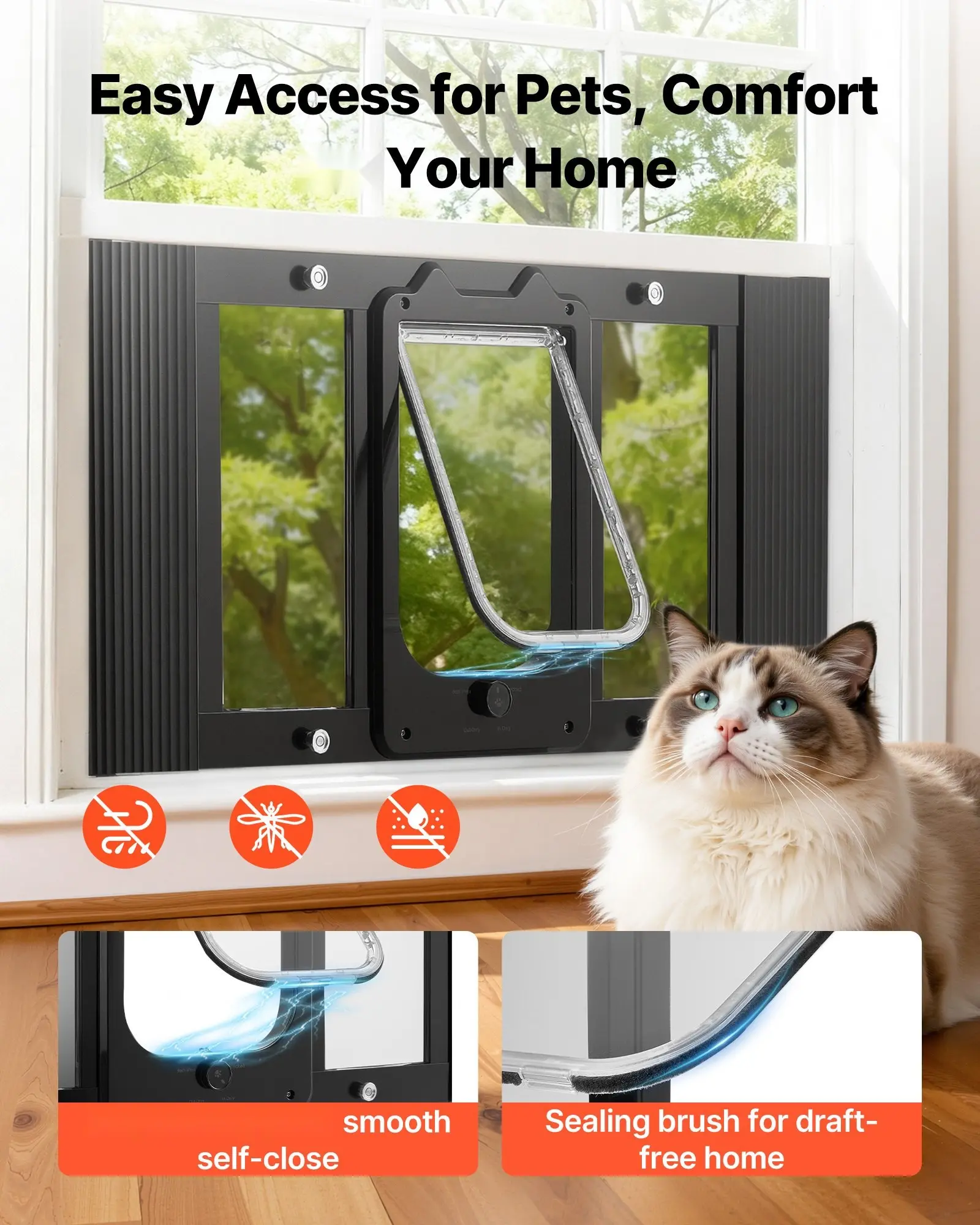 ·Smooth Auto-Close & Tight Seal: The magnetic flap pairs with a brush-lined edge for smooth, quiet self-closing and a secure seal. Our window pet door helps keep your indoor space warm and clean as your cat moves through