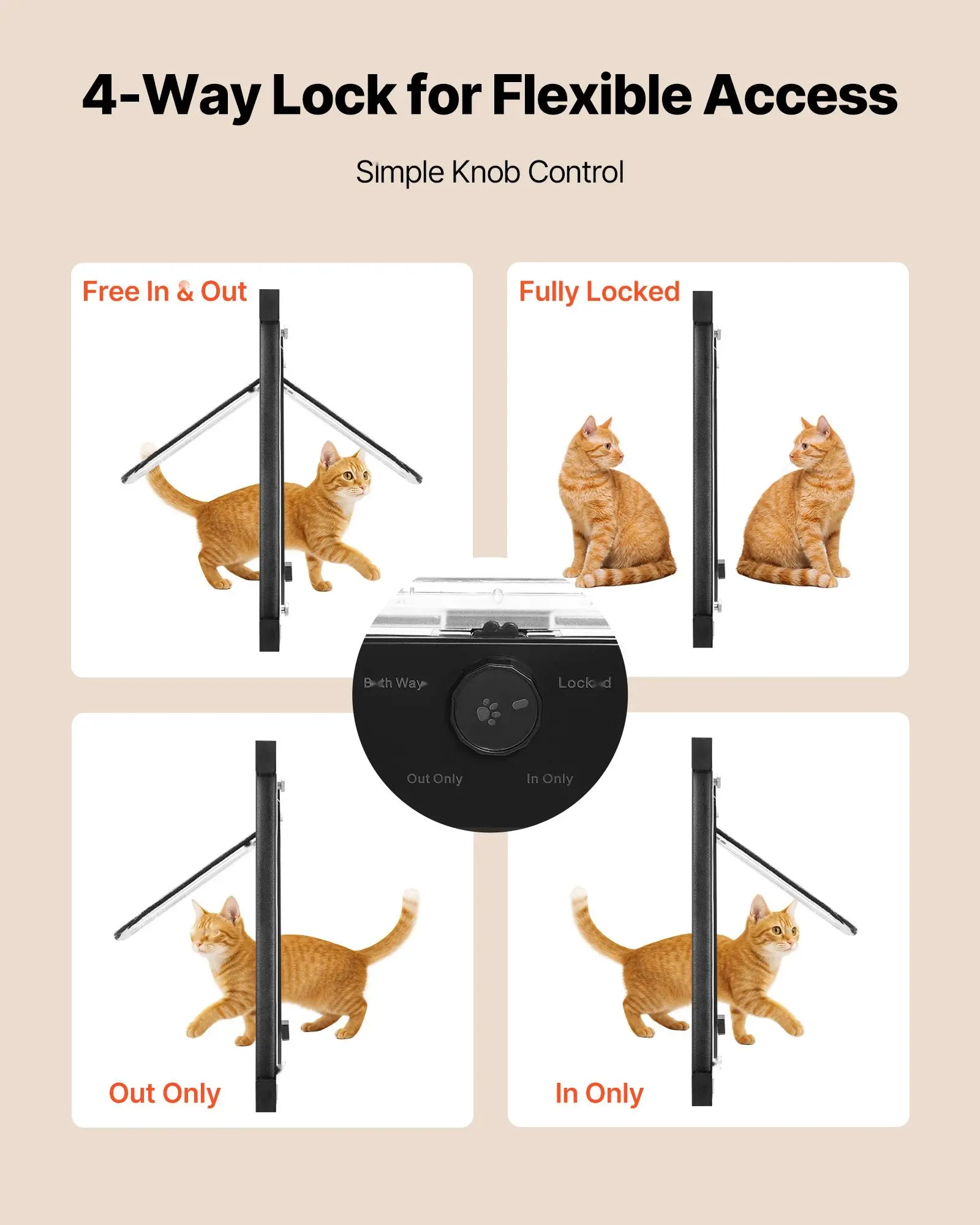 ·4-Way Locking System: Switch between in-only, out-only, two-way access, or full lock mode. This aluminum window cat door gives your cat flexible movement while helping maintain a calm home environment