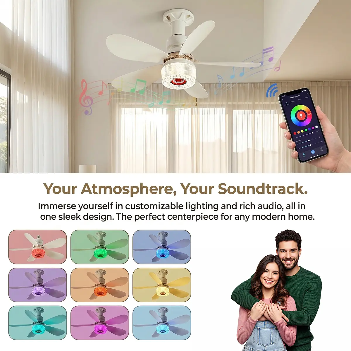 Bluetooth listening, entertainment on the go. Equipped with a 2-inch 4Ω 5W speaker, the Bluetooth name is DKFS-01. It allows quick connection to devices for music playback. The combination of fan light and sound system brings auditory pleasure while providing daily ventilation and lighting.