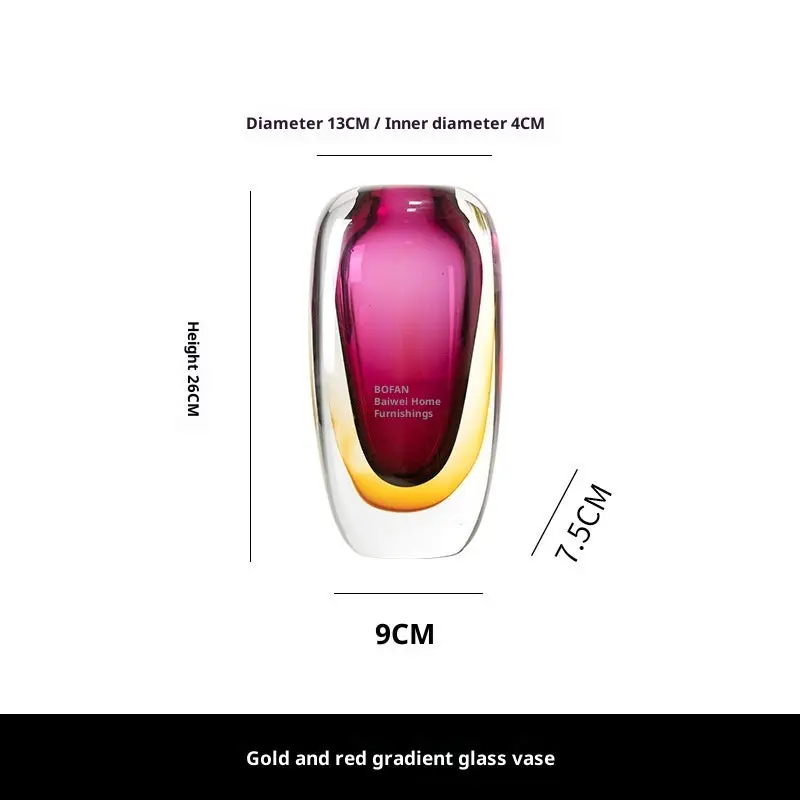 Transform your living space into a haven of sophistication with the Modern Luxury Glass Vase. Crafted from exquisite colored glass, this stunning piece boasts a captivating gold-red gradient that exudes the essence of light luxury. Its smooth, polished surface reflects elegance, making it a perfect match for any decor.