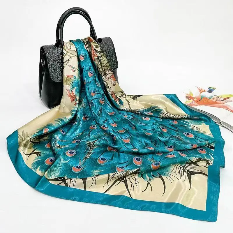 Women’s faux silk scarf/headscarf with peacock print; beach headscarf; soft and elegant; suitable for all seasons; multifunctional large square headscarf (90 cm × 90 cm); a perfect accessory—ideal as a headscarf or headband, especially for enhancing overa