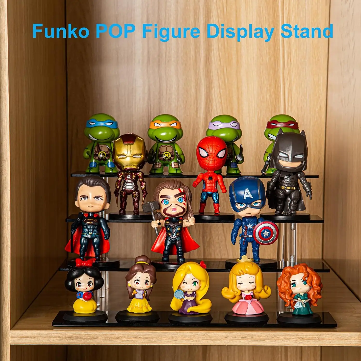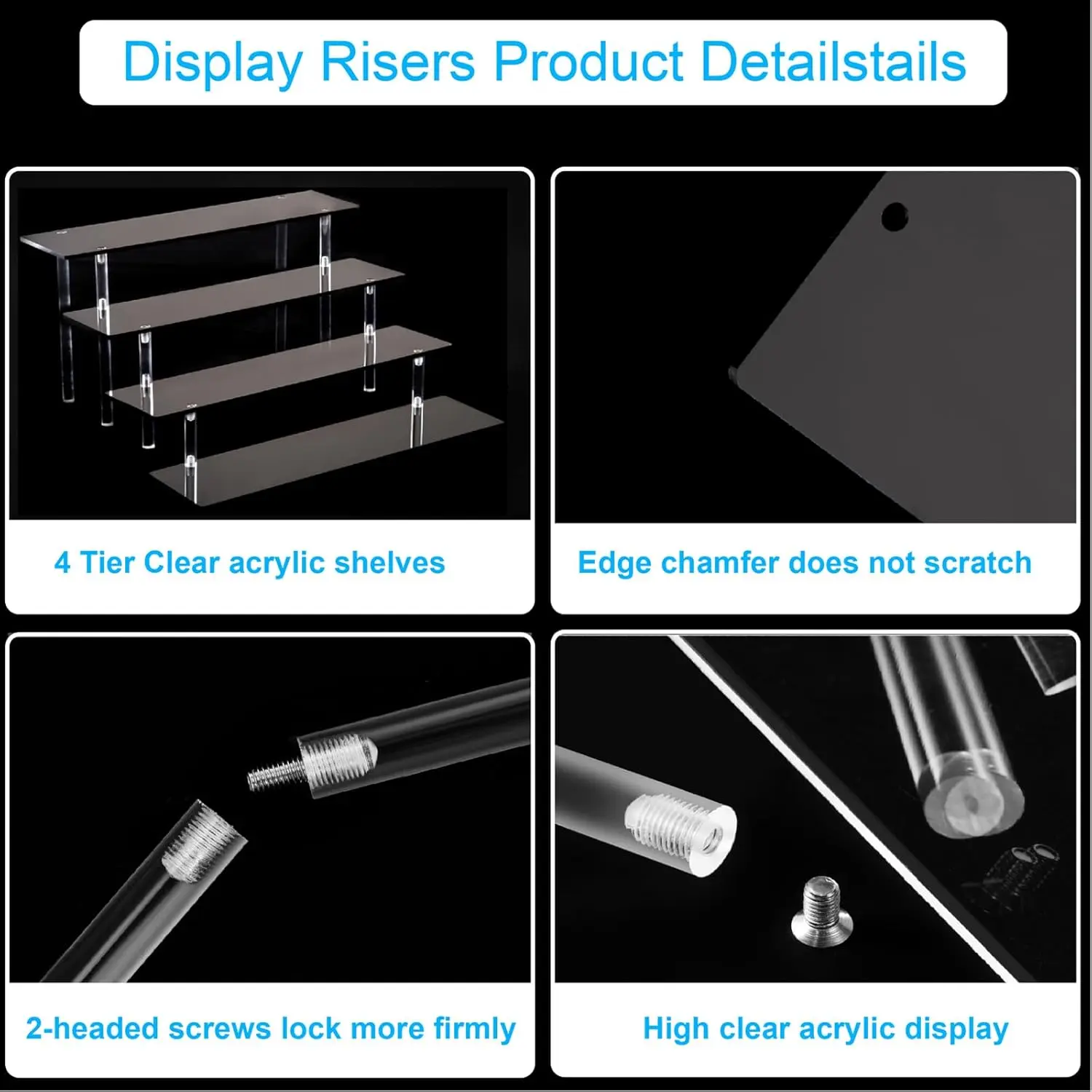 ·Keep things organized: 4 Tier black acrylic display risers can keep your things organized, saves space. You can find them quickly and easily, no more searching messy drawers, all of your things. Acrylic risers for display shelves are easy to place, fit on your dresser, table organization, funko pop display case, and are also suitable for all colors or themes of the room