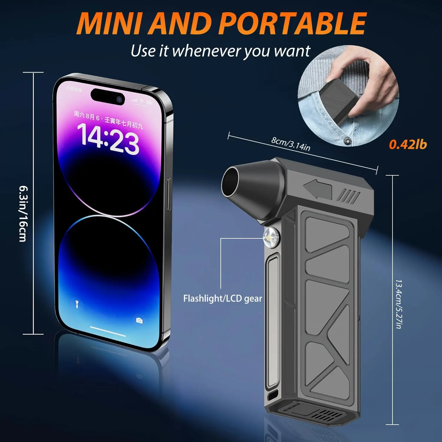 ·【Adjustable Speed Mode】This Portable Mini Turbo Snow Blower features multiple airflow modes and a rolling wheel that allows you to easily switch between a gentle dust removal mode (suitable for furniture, electronics, pet grooming, etc.) and a high-speed airflow mode (suitable for outdoor snow removal or car drying). Multiple wind speed options make it easy to handle various cleaning tasks
