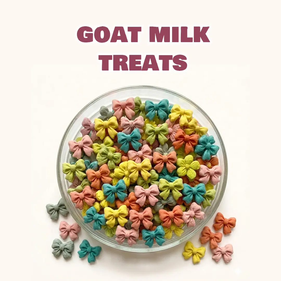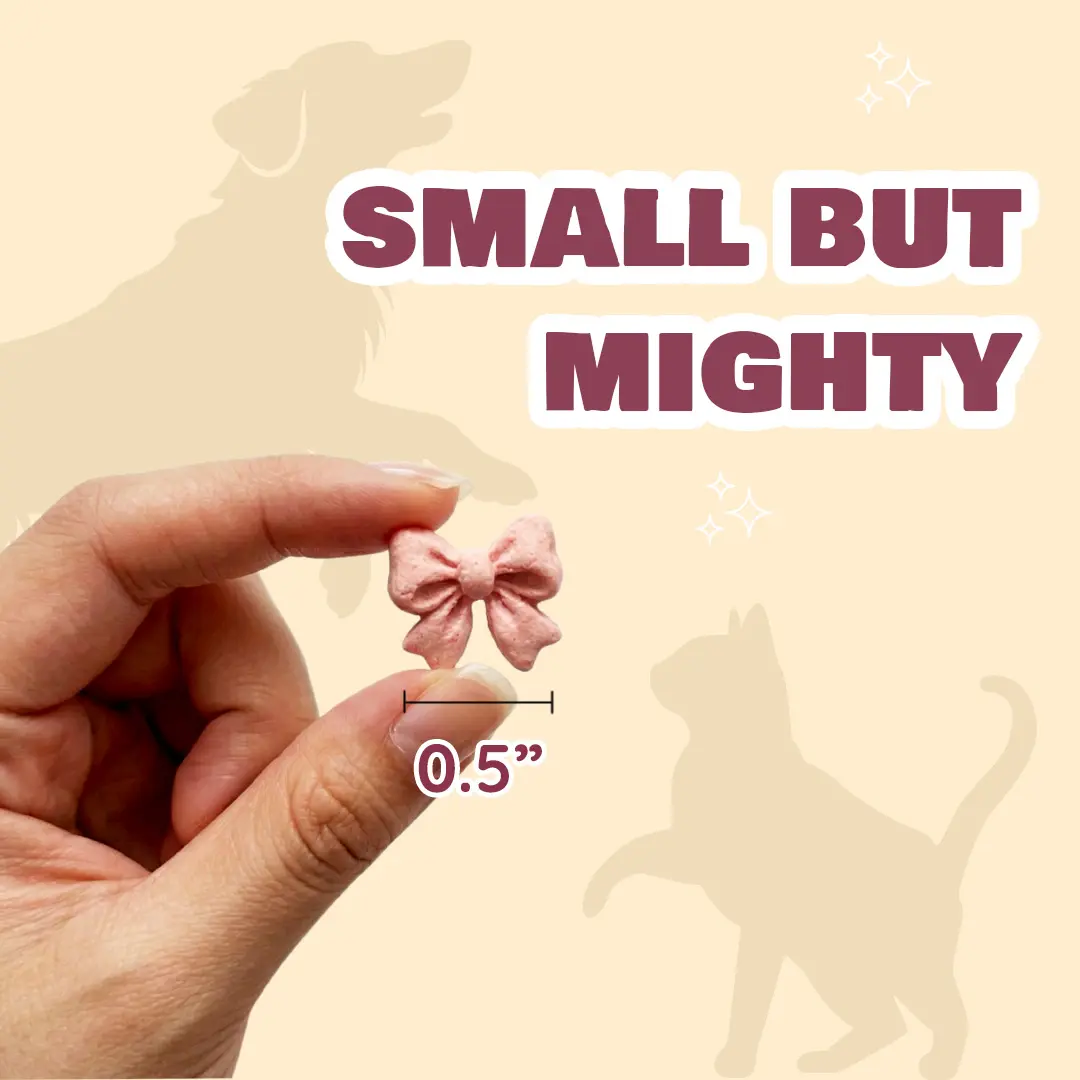 Benji & Louie Goat Milk Ribbon Bites bring a playful, coquette-inspired twist to everyday pet treats. Designed in adorable bow shapes, these bites are made with real goat milk and chicken, plus a touch of fruit and veggie powder for a naturally fun and colorful snack.