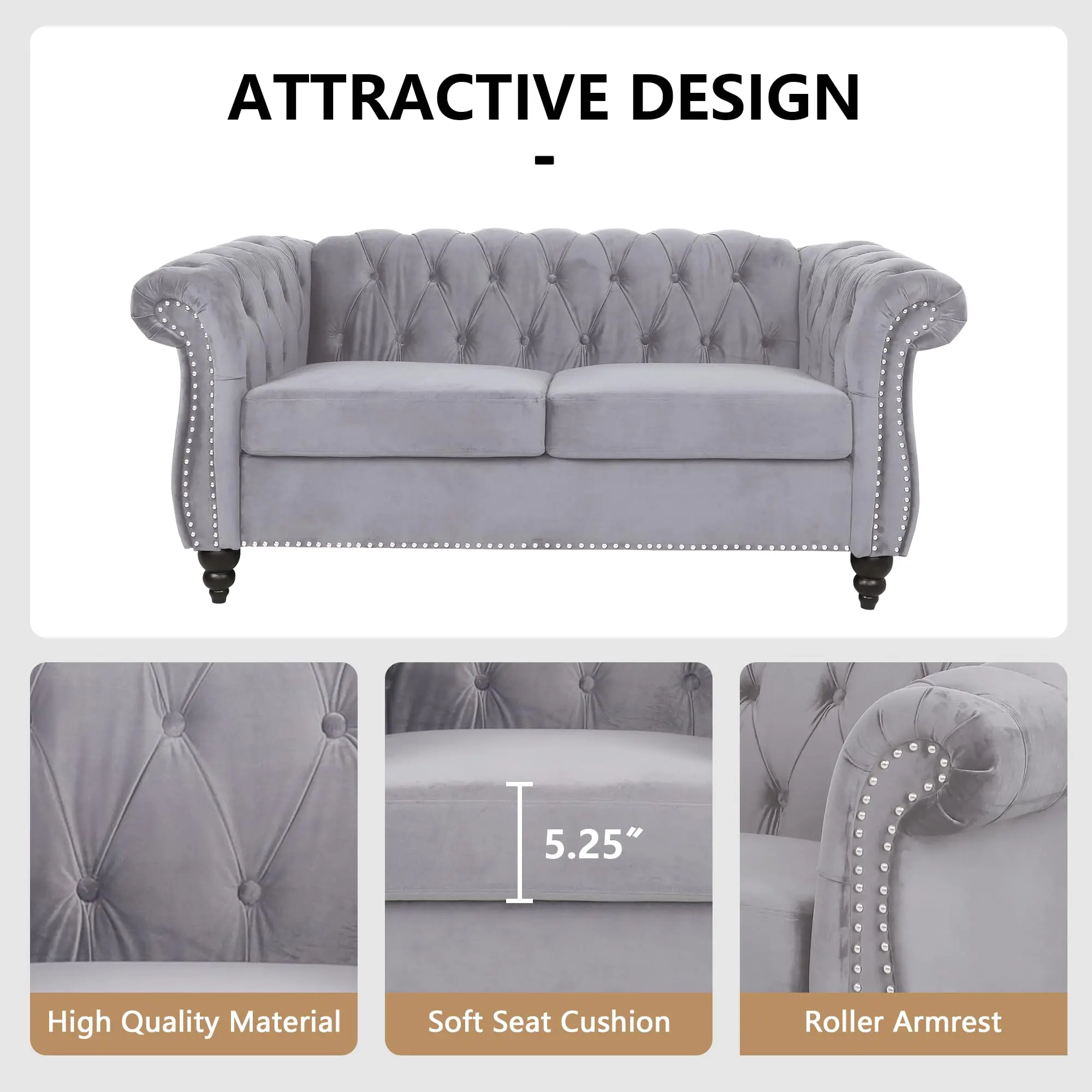 The Giratree Furniture Chesterfield Velvet Sofa features a traditional Chesterfield style with tufted deep button and nailhead accents. Its scrolled arms add a touch of luxury. Perfect for living rooms, apartments, homes, or offices, this sofa offers a durable frame and plush cushion support.
