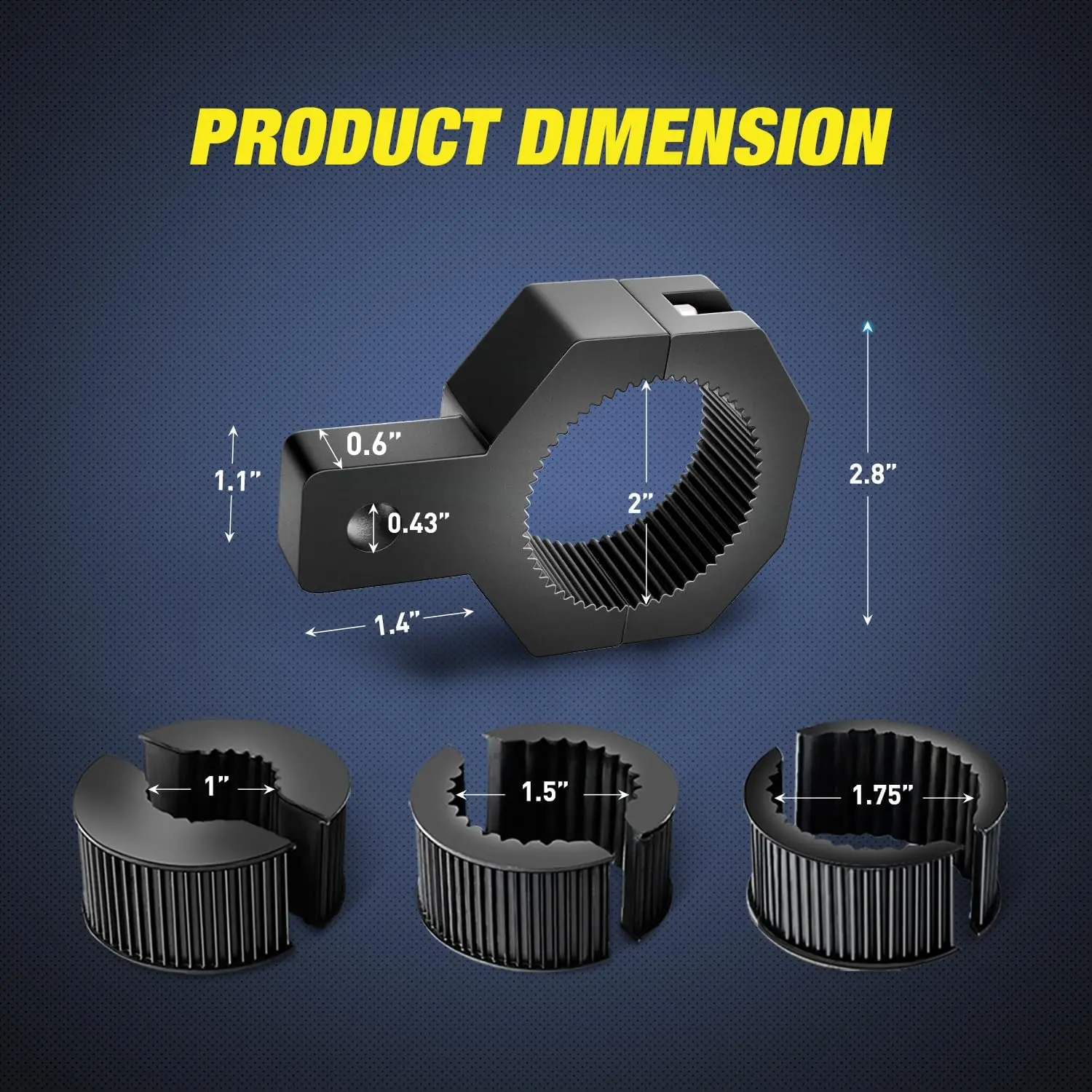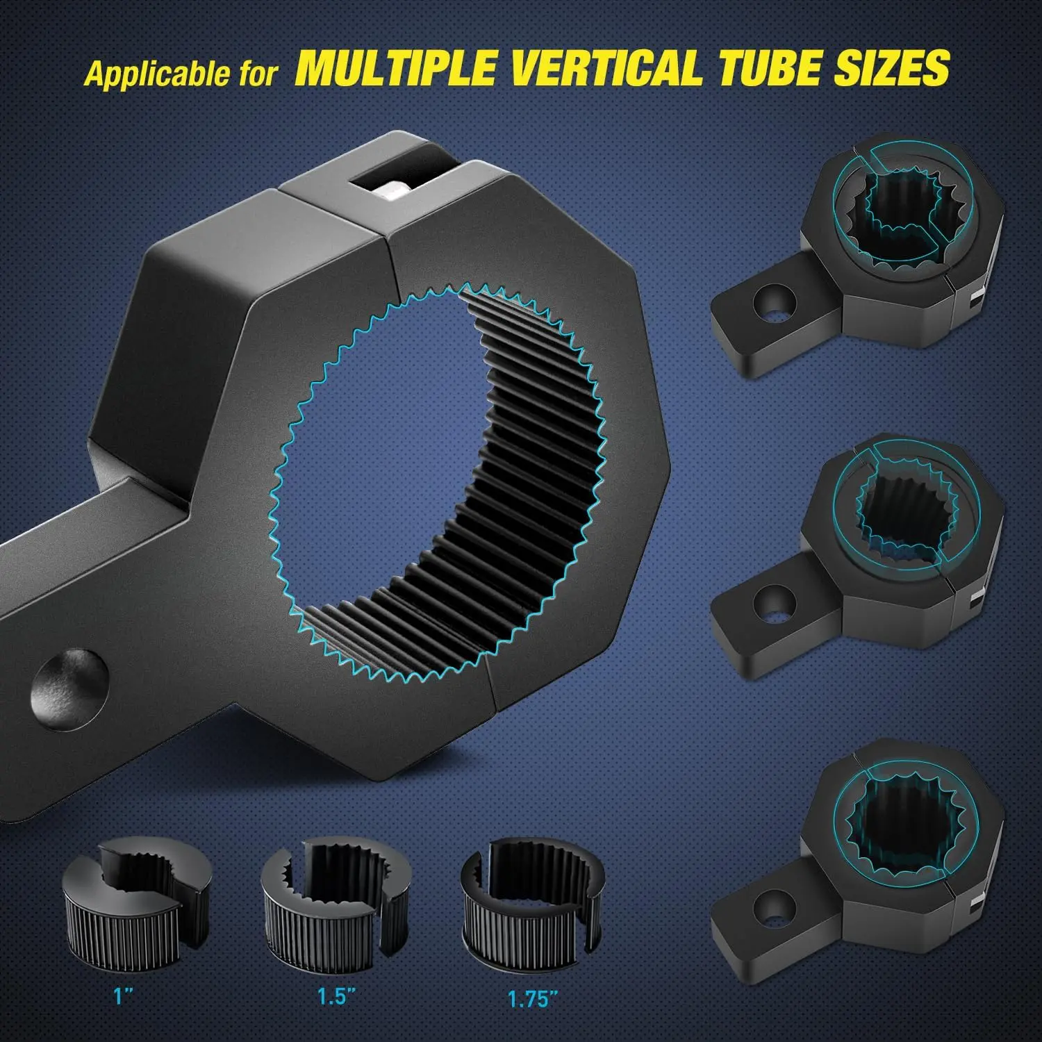 The bar clamp is designed for size: 1”, 1.5”, 1.75”, 2”. Convenient and simply the installation.